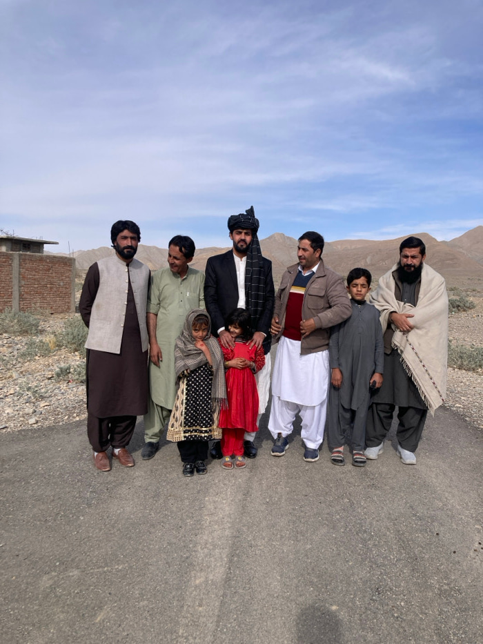 Seven people stand side-by-side on a paved road against a backdrop of mountains and sky. They appear to be family, likely in a rural area. The adults wear traditional clothing, including shawls and ve…read more