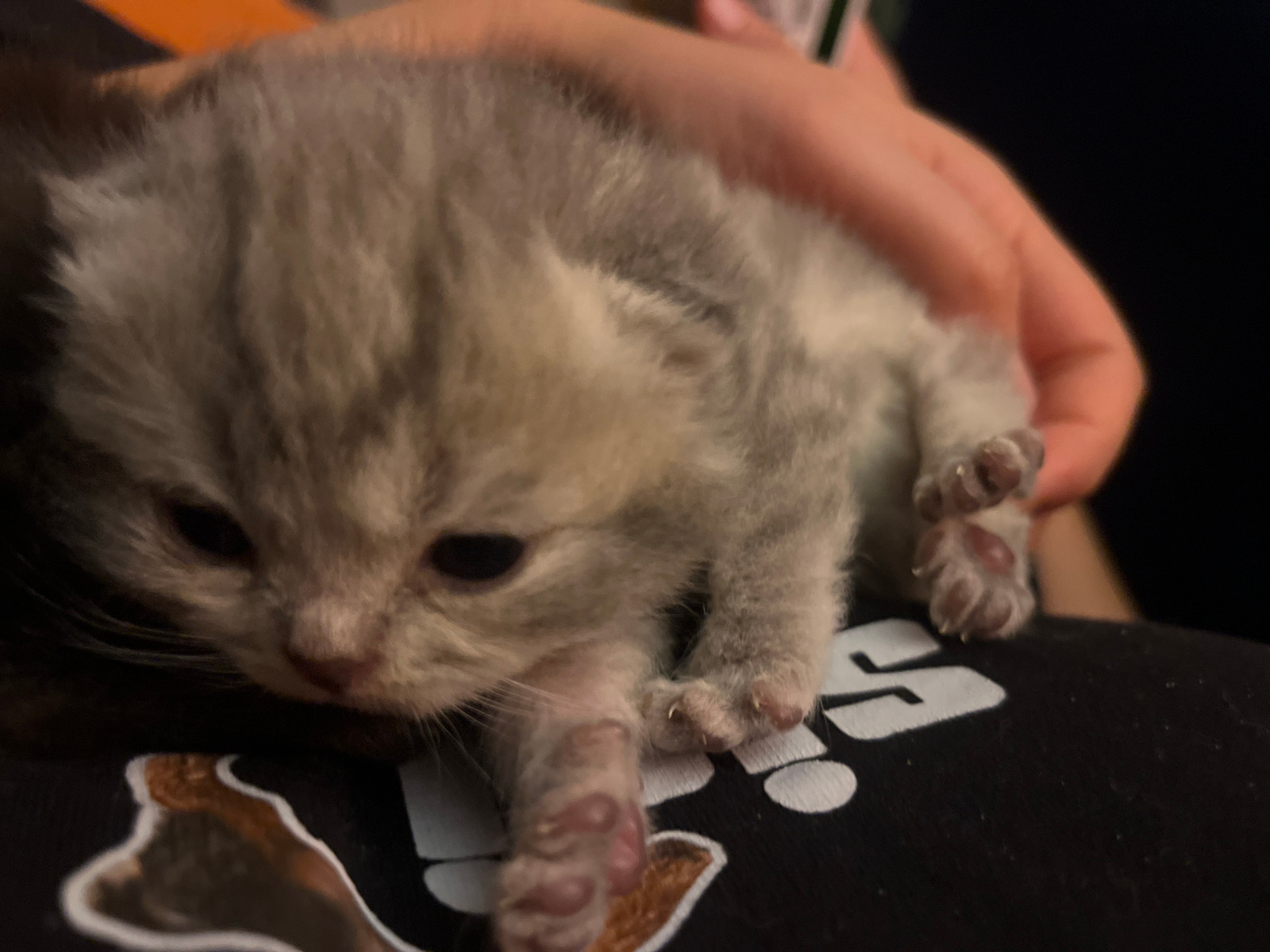 A close-up shot shows a kitten being held in someone's hand. The kitten has grey and white fur and small pink paw pads visible on its outstretched paws. The background includes a black shirt with a wh…read more