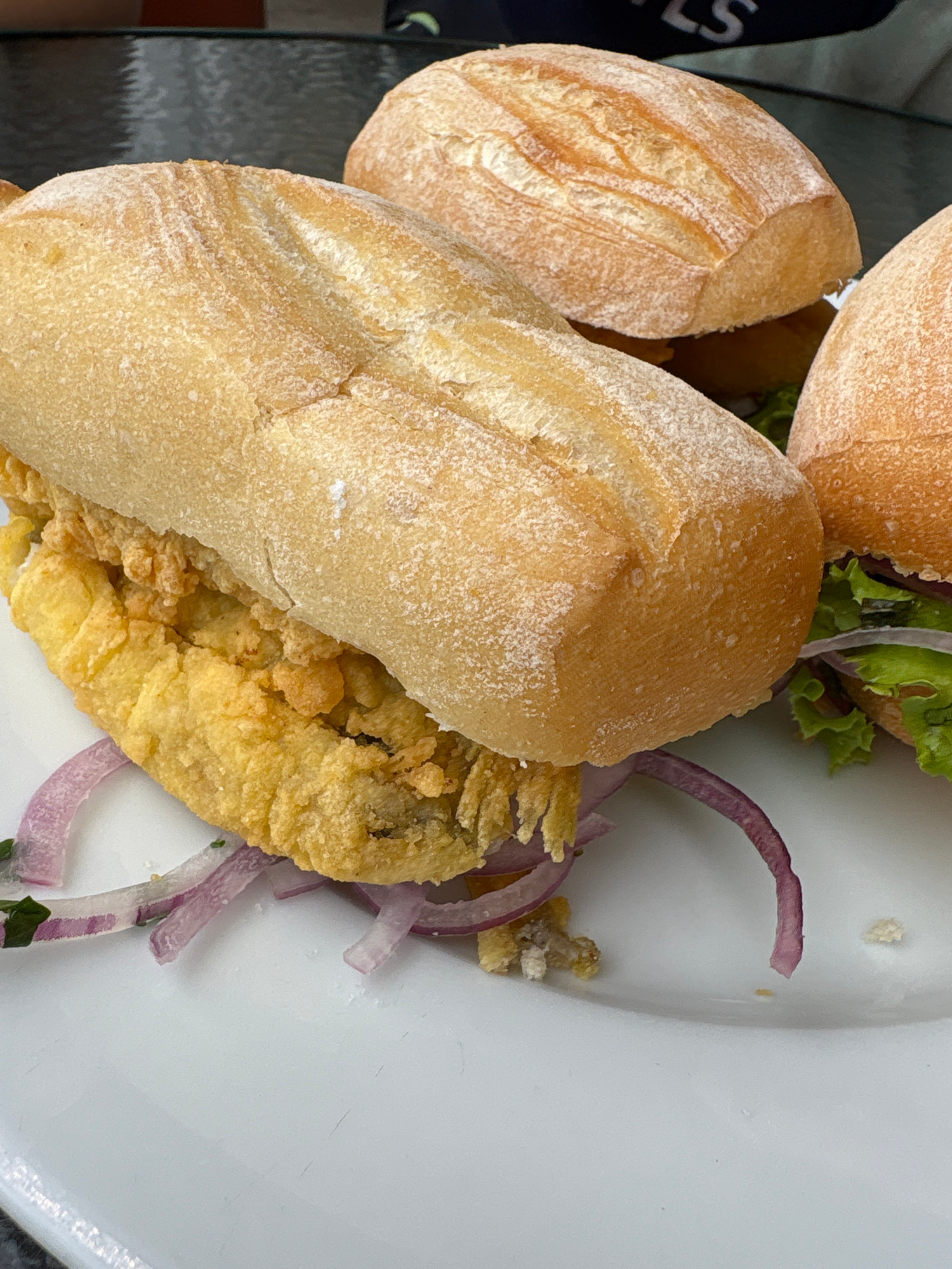 The image shows three sandwiches on a white plate. The sandwiches appear to contain fried food, possibly fish or chicken, and are garnished with red onions. The location is likely Ancón, Peru.