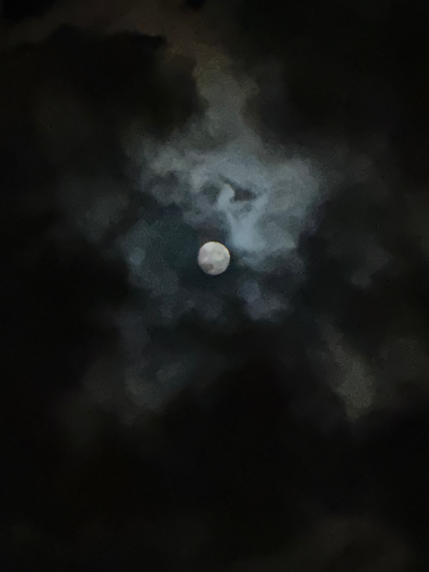 The image depicts a full moon seen through clouds at night. The moon is slightly off-center, positioned towards the middle right of the frame. The clouds are dense and dark, obscuring the moon's light…read more