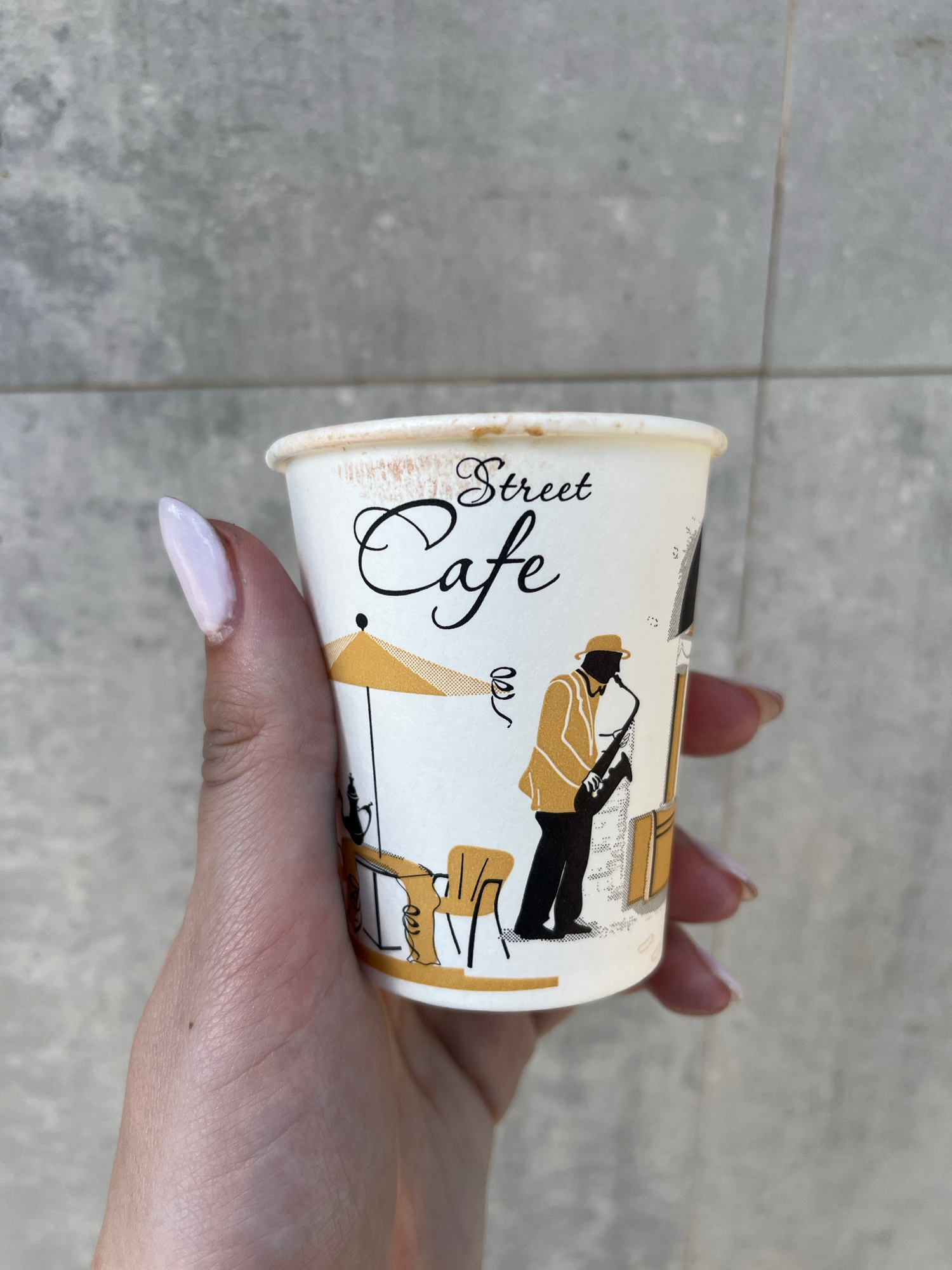 A person is holding a white paper coffee cup in their hand against a light gray tiled background. The cup has a design depicting a street cafe scene in shades of black and gold. The text "Street Cafe"β¦read more