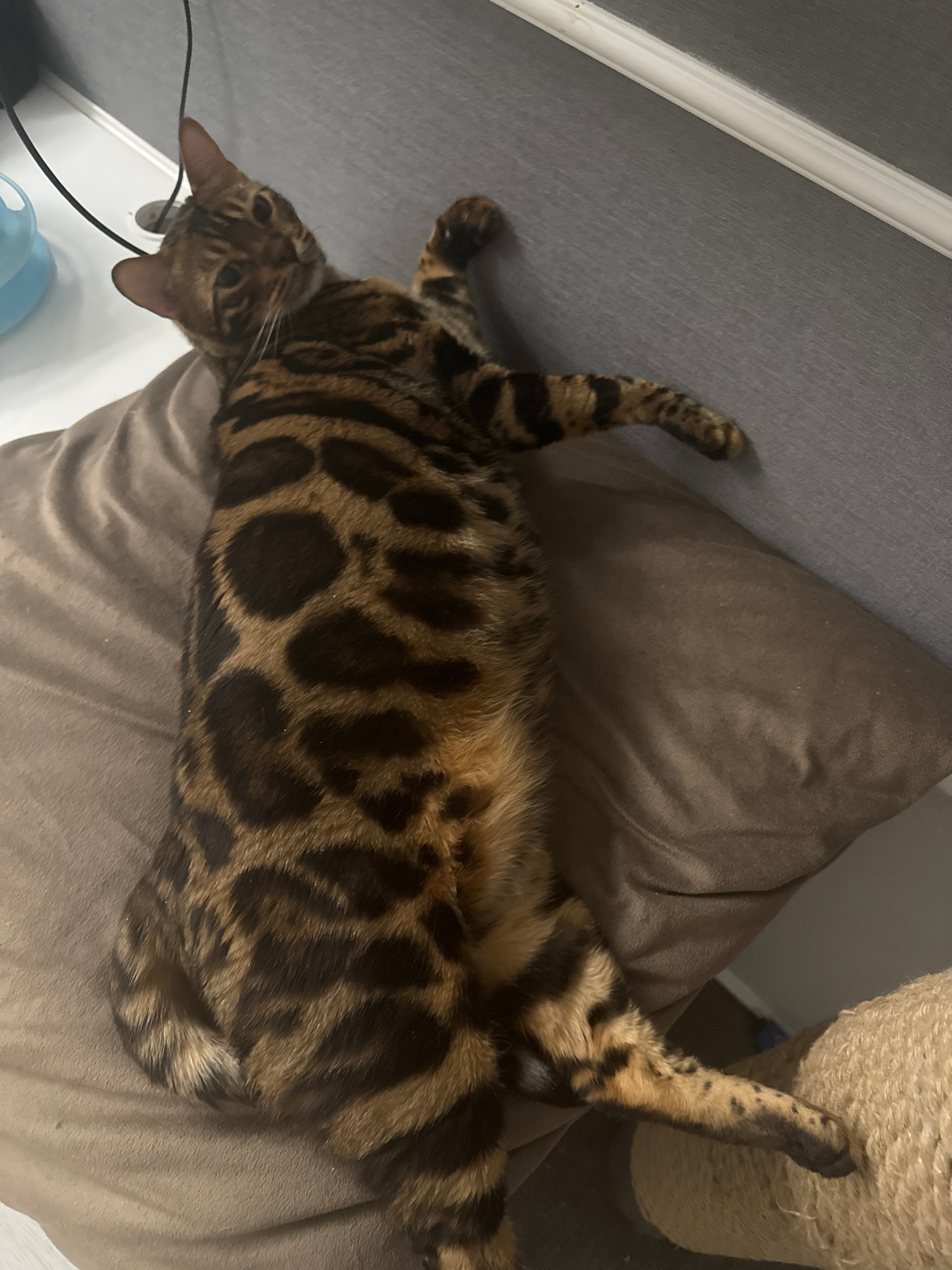 A Bengal cat lies on its back on a brown cushion. The cat has distinctive dark brown spots on a lighter brown coat. One leg is raised and stretched near a scratching post. The other leg is also raised…read more