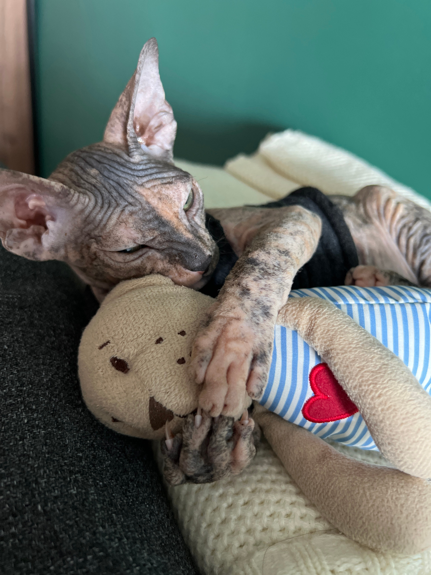 A close-up shot features a hairless Sphynx cat, likely indoors. The cat is lying on its side, embracing a stuffed animal. The stuffed animal is wearing a blue and white striped shirt with a red heart…read more