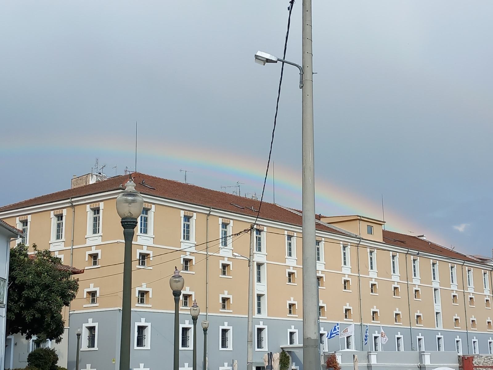 The image depicts a three-story building with a red tile roof in the city of Drama, Greece. The building's exterior features a two-tone color scheme, with a tan upper section and a gray lower section.…read more