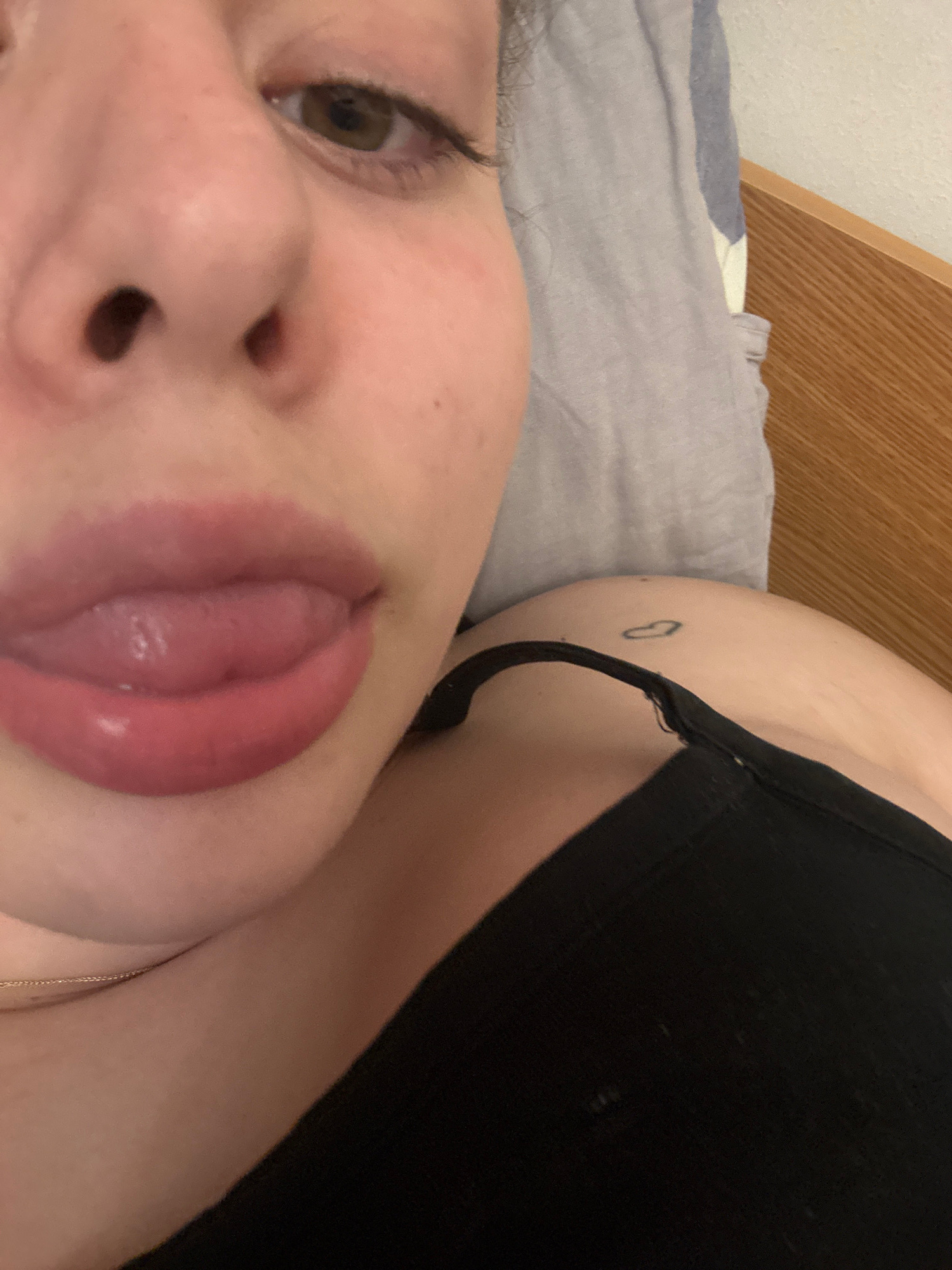 The image presents a close-up, low-angle view of a person's face and upper chest area, likely in a domestic setting. The person is lying down with their head tilted towards the camera. Visible facial…read more