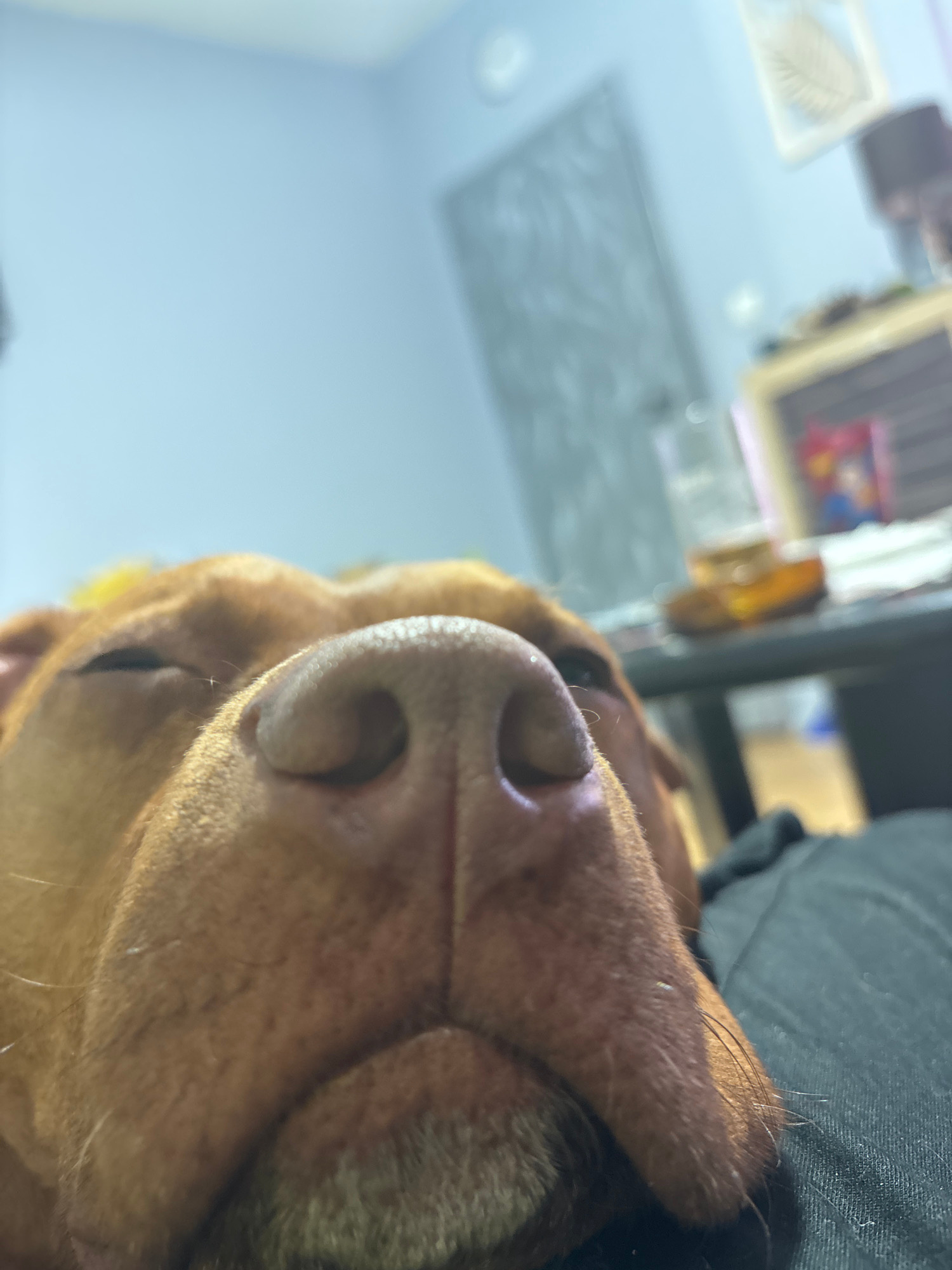 A close-up, angled shot shows the face of a sleeping brown dog. The dog's nose is large and prominent, taking up a significant portion of the foreground. Its eyes are closed, and its brown fur is visi…read more