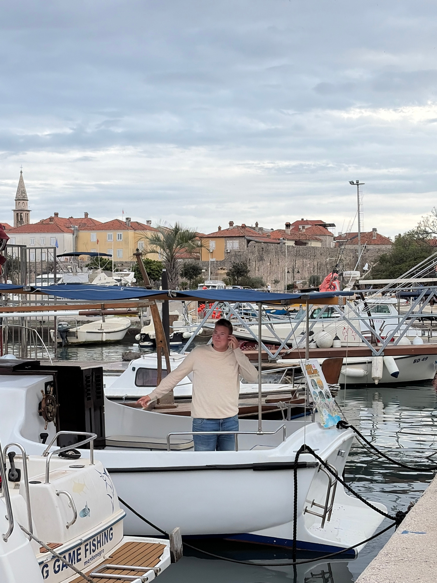 The image shows a man standing on a boat in a marina. The buildings of Budva, Montenegro, are visible in the background. The sky is overcast. The man is wearing a beige sweater and blue jeans. He has…read more