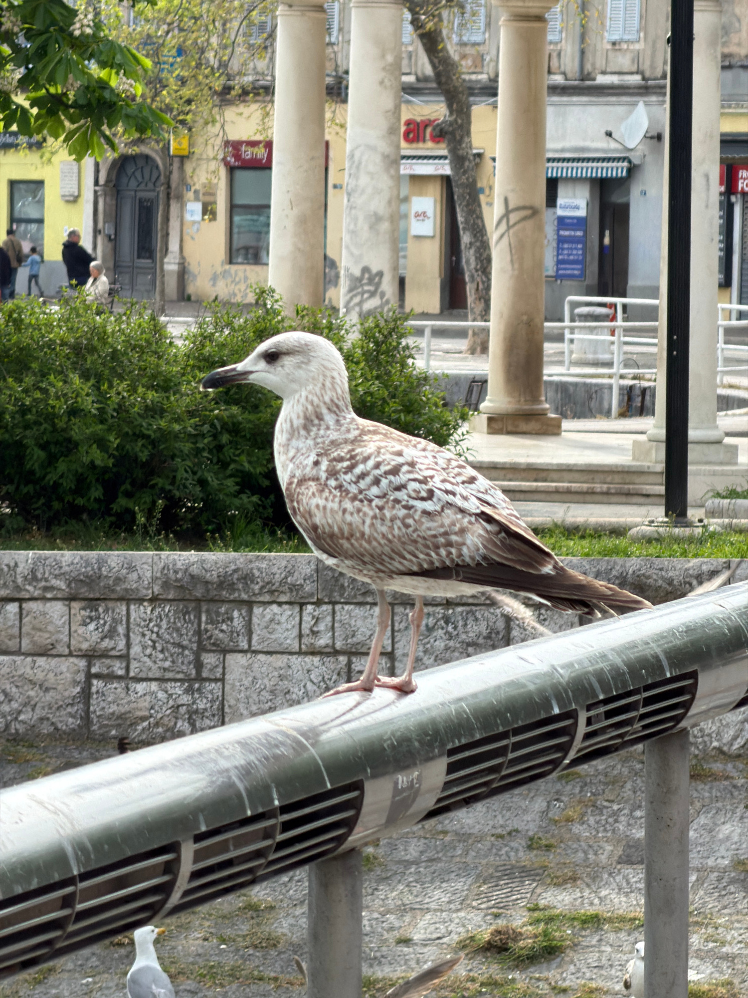 A horizontally oriented image shows a bird standing on a silver-colored pipe. The bird has a white head, a long, thin beak, and feathers that are patterned with white and brown. It is standing on a gr…read more