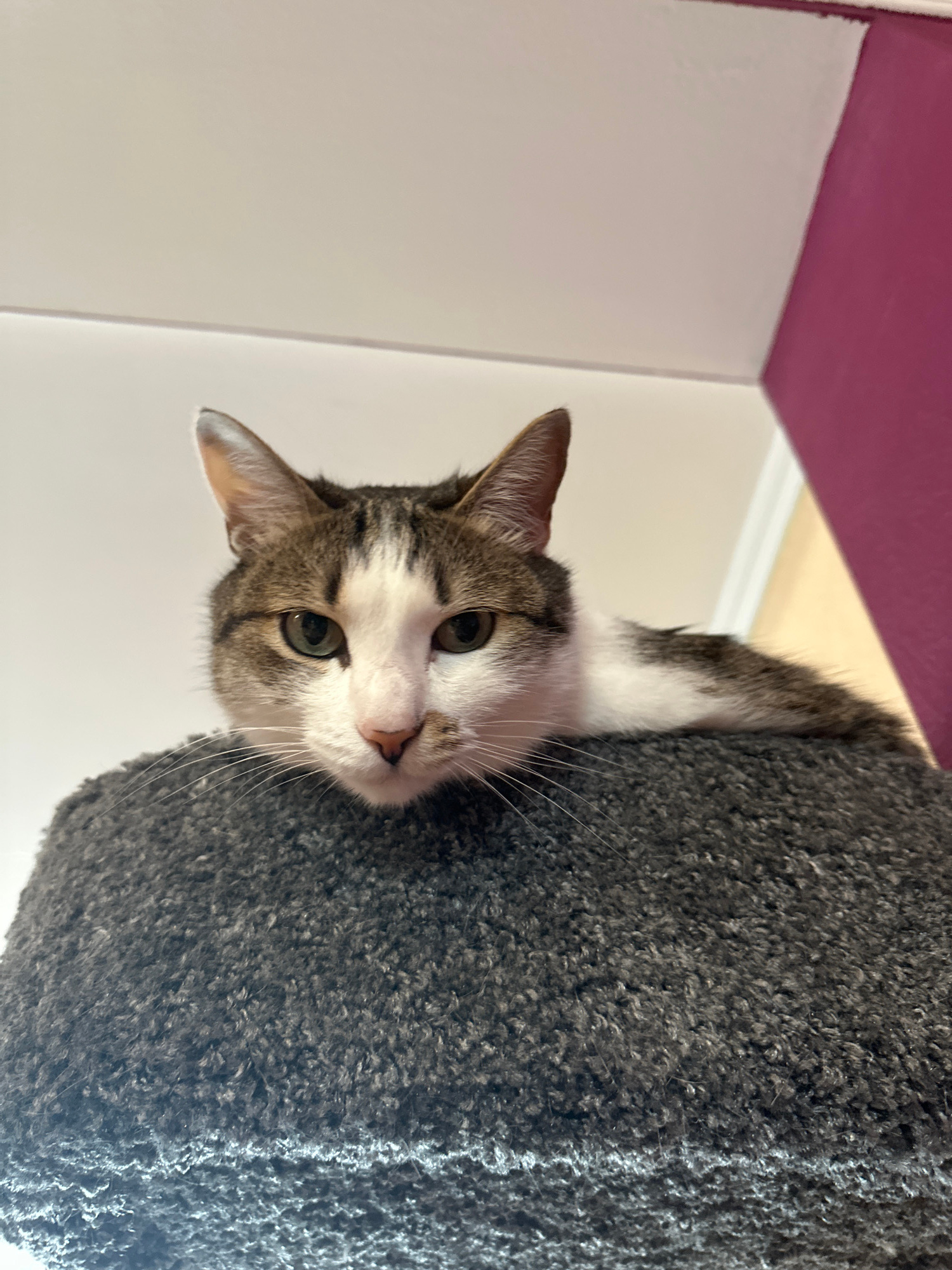 A cat with brown and white fur is perched on a gray, fuzzy cat tree. The cat is looking down at the camera. The background includes a white wall with a purple section at the top.