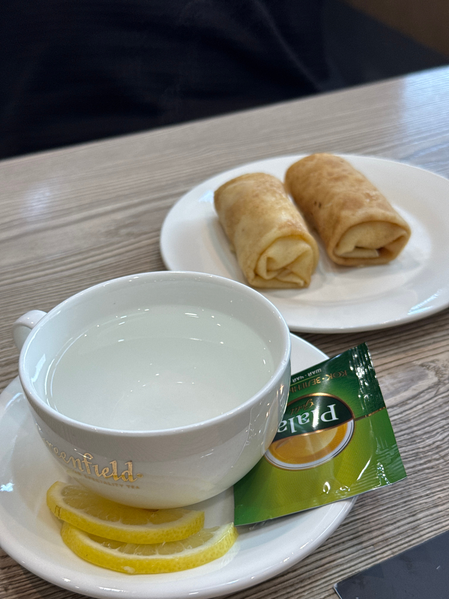 The image displays a light meal or snack arranged on a light-colored wooden table. On the left, a white plate holds two golden-brown, rolled items, resembling blini or crepes. To the right, a white te…read more