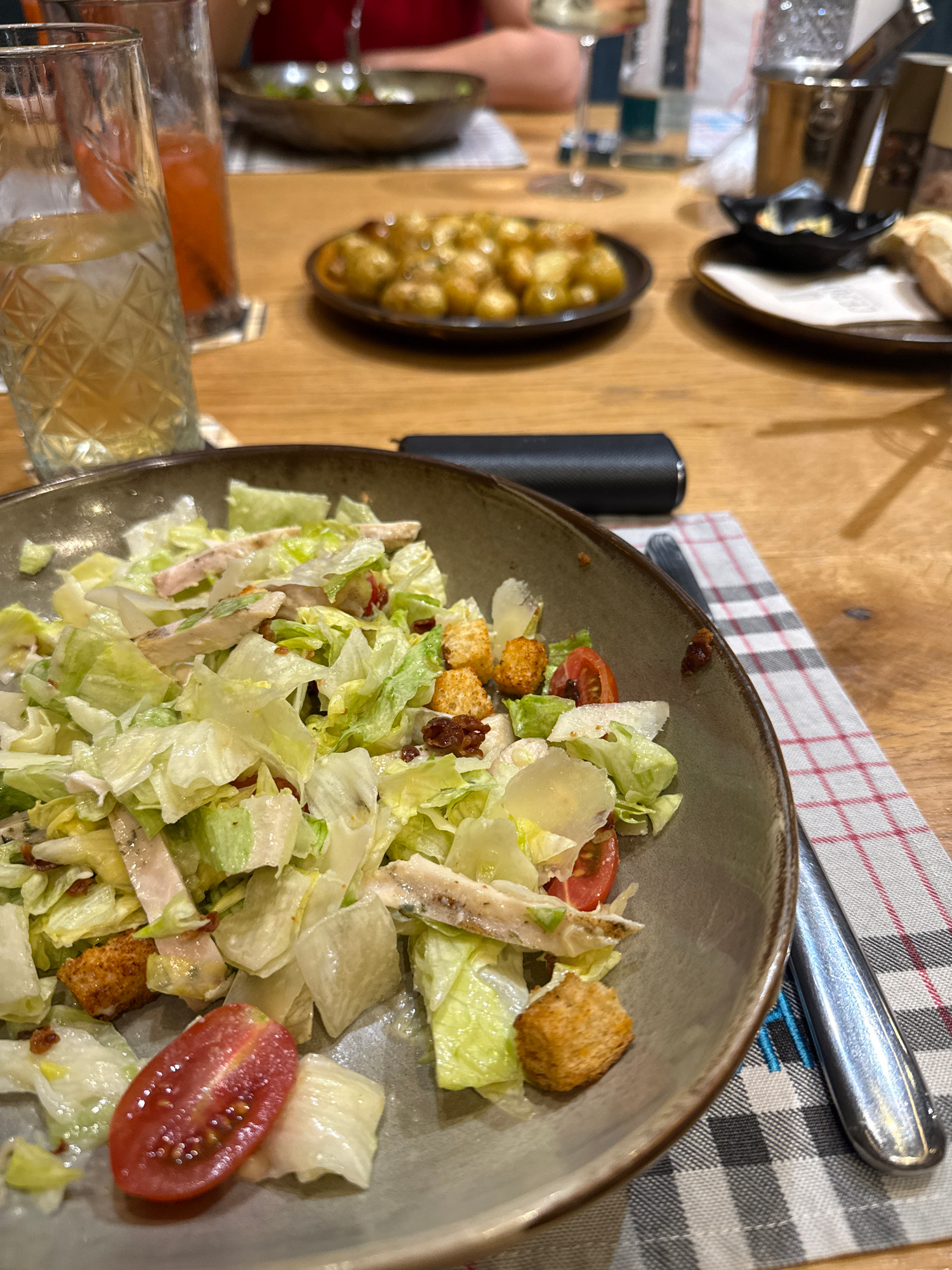 The image presents an overhead view of a dining table, focusing on a large bowl of salad. The salad, which appears to be a Caesar salad, is comprised of crisp chopped lettuce, sliced chicken pieces, g…read more