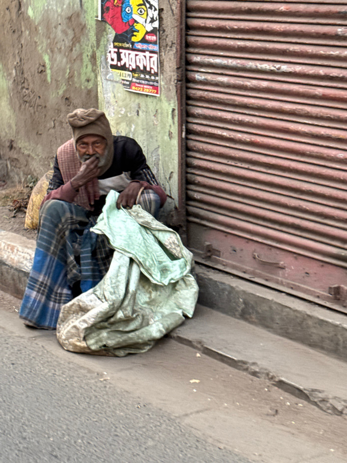 A homeless person sits wrapped in blankets and clothing under a corrugated metal awning. They are positioned against a concrete wall next to a poster. The individual wears a knit cap and a patterned s…read more
