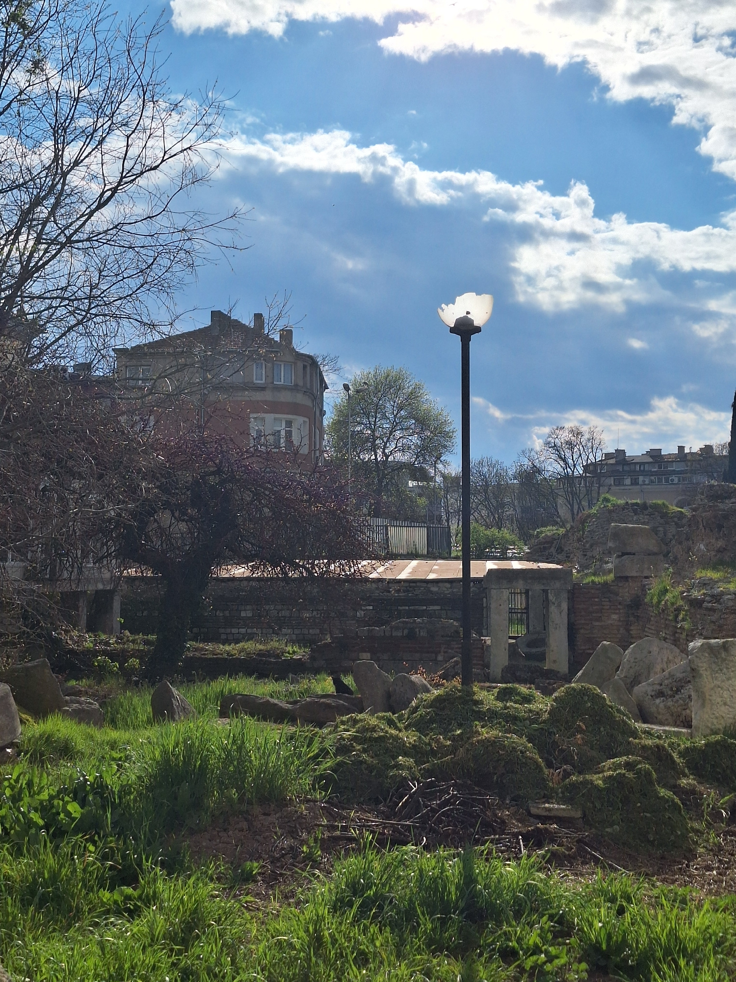The image shows an outdoor scene in Varna, Bulgaria. A street light with a broken shade stands in the center of the frame against a blue sky with white clouds. To the right of the light, there is gree…read more
