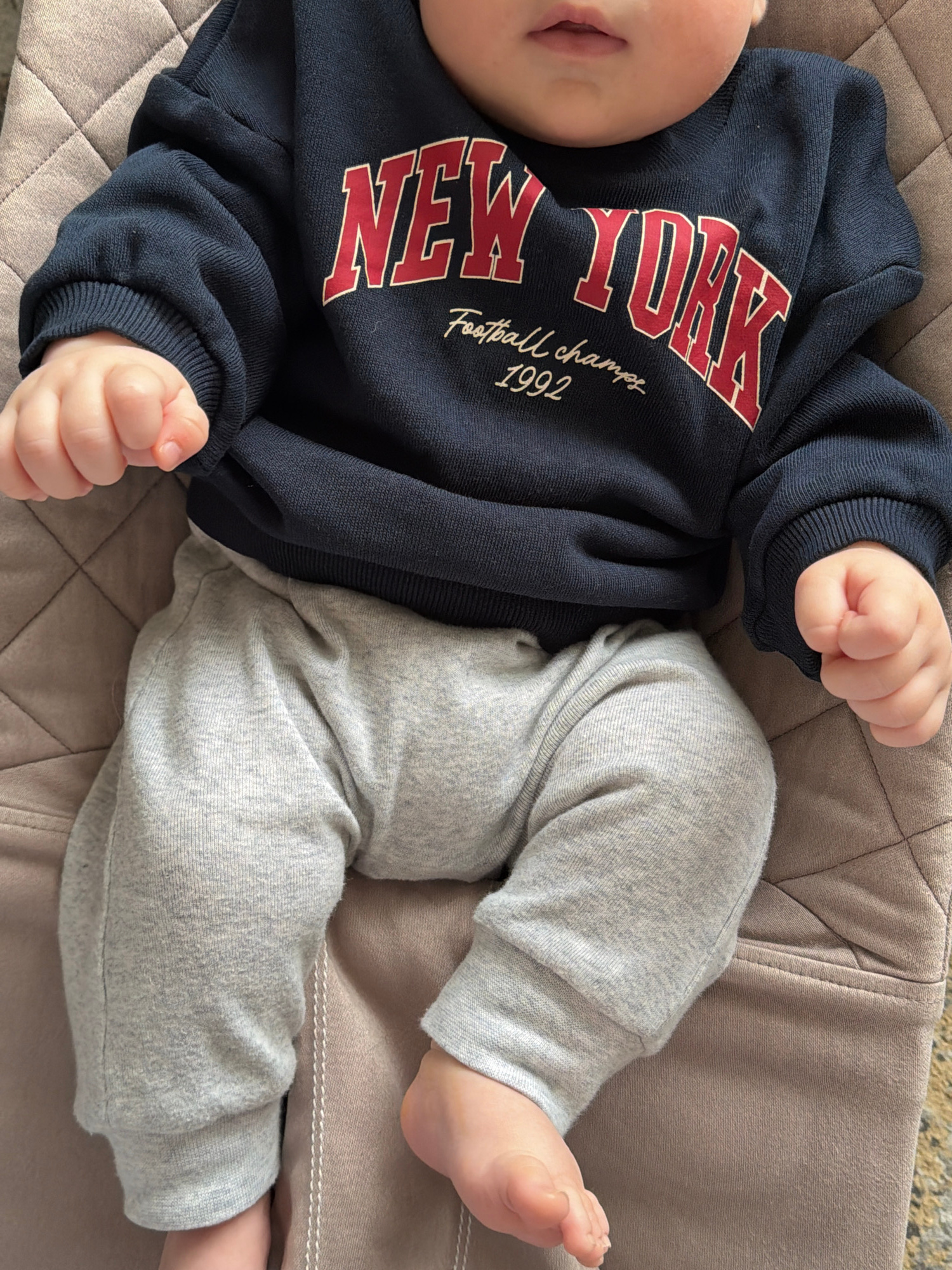 An overhead shot captures a baby lying comfortably on a beige quilted surface, likely a bouncer or a soft chair, in an indoor setting. The baby is dressed in a navy blue long-sleeved sweatshirt and li…read more