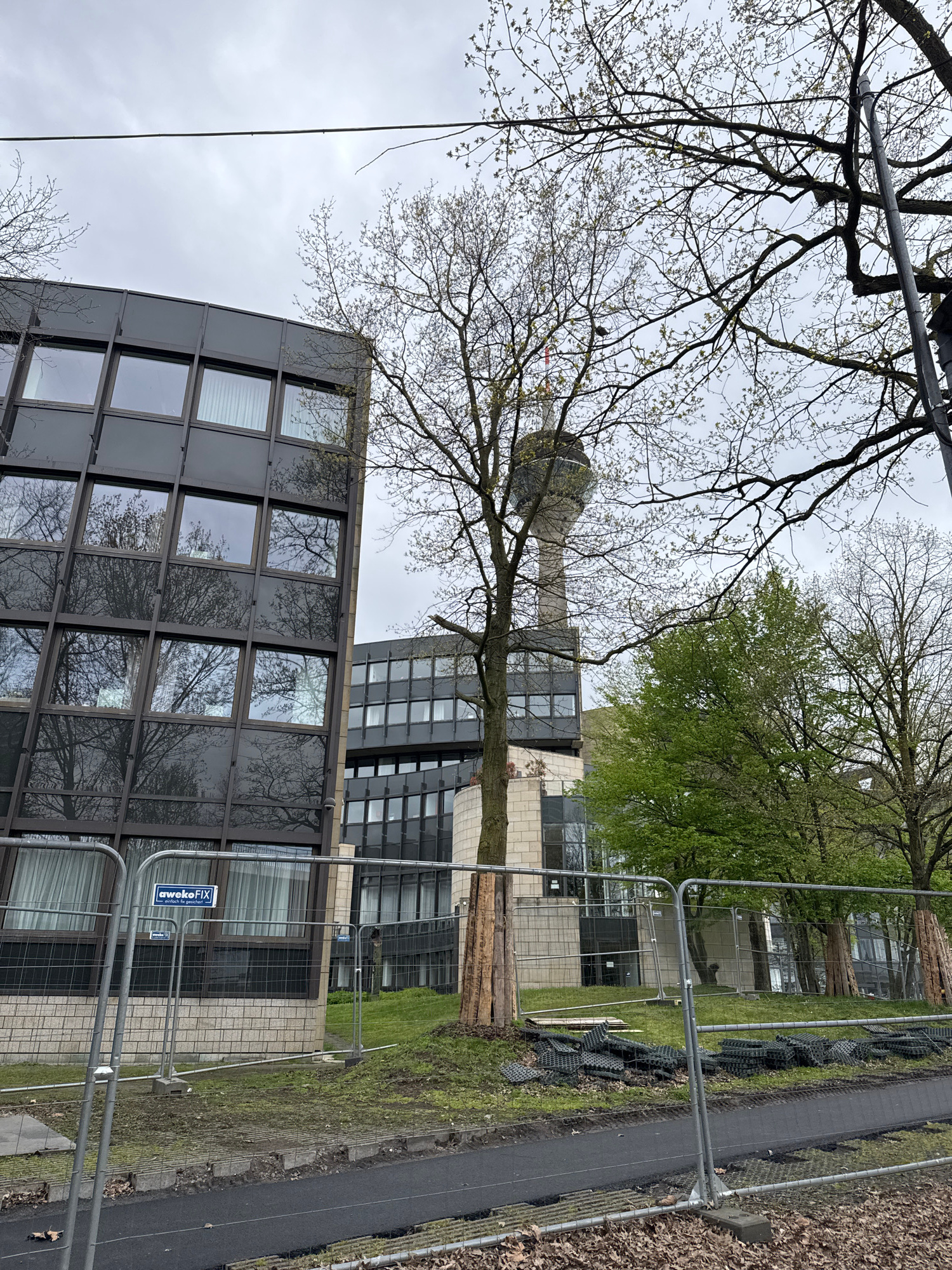 The image shows a view of the Rheinturm (Rhine Tower) in Dusseldorf, Germany, seen through bare tree branches and modern office buildings with reflective glass windows. A temporary construction fence…read more
