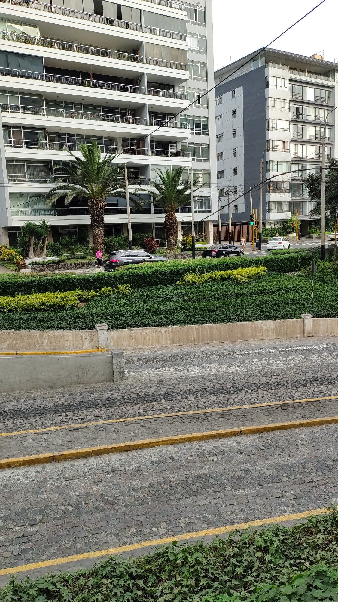 The image captures an urban scene in Miraflores, Peru. The focus is on the intersection of a road and a bridge. The road has yellow dividing lines and is paved with cobblestones. The bridge is charact…read more