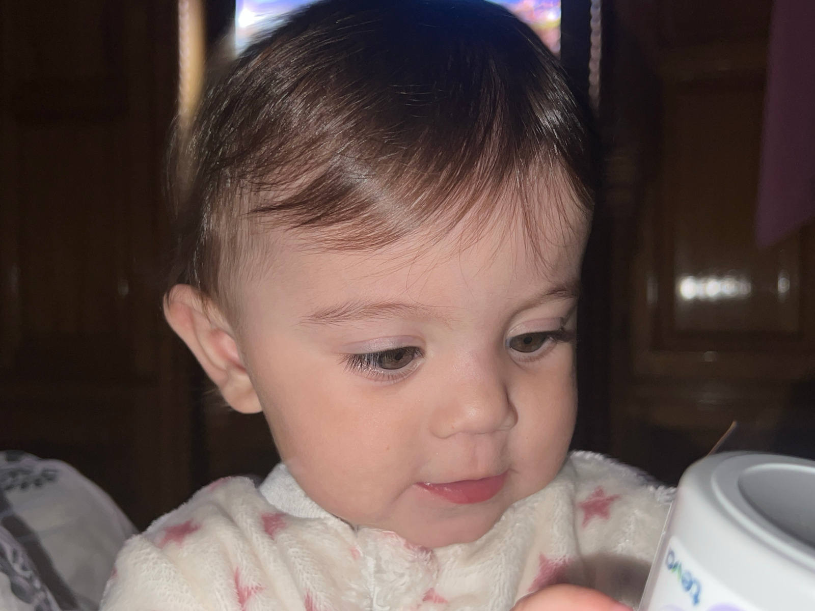 A close-up shot of a baby with brown hair and eyes. The baby is wearing a white pajama top with pink stars. The background is dark and indistinct, but seems to be a room interior. A portion of a whiteβ¦read more