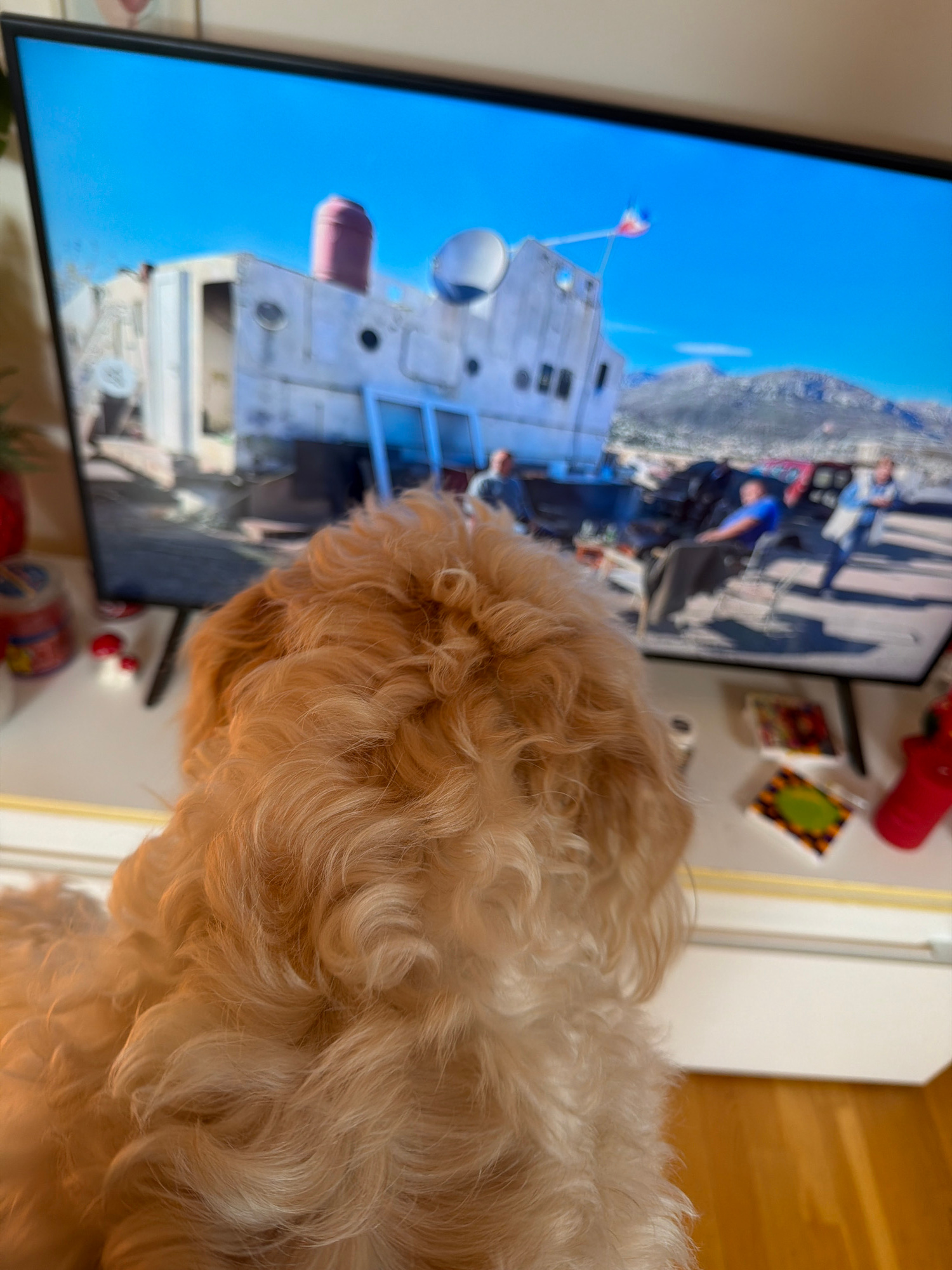 The image shows a television screen displaying an unidentified scene with a white structure under a blue sky, possibly a building or installation. The structure has a flag on top. Part of a mountain a…read more