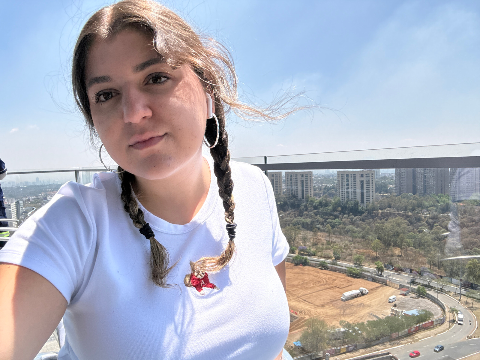 A woman is looking directly at the camera. She has light skin and brown eyes. Her blonde hair is styled in two braids with black elastics. She is wearing silver hoop earrings and a white t-shirt with…read more