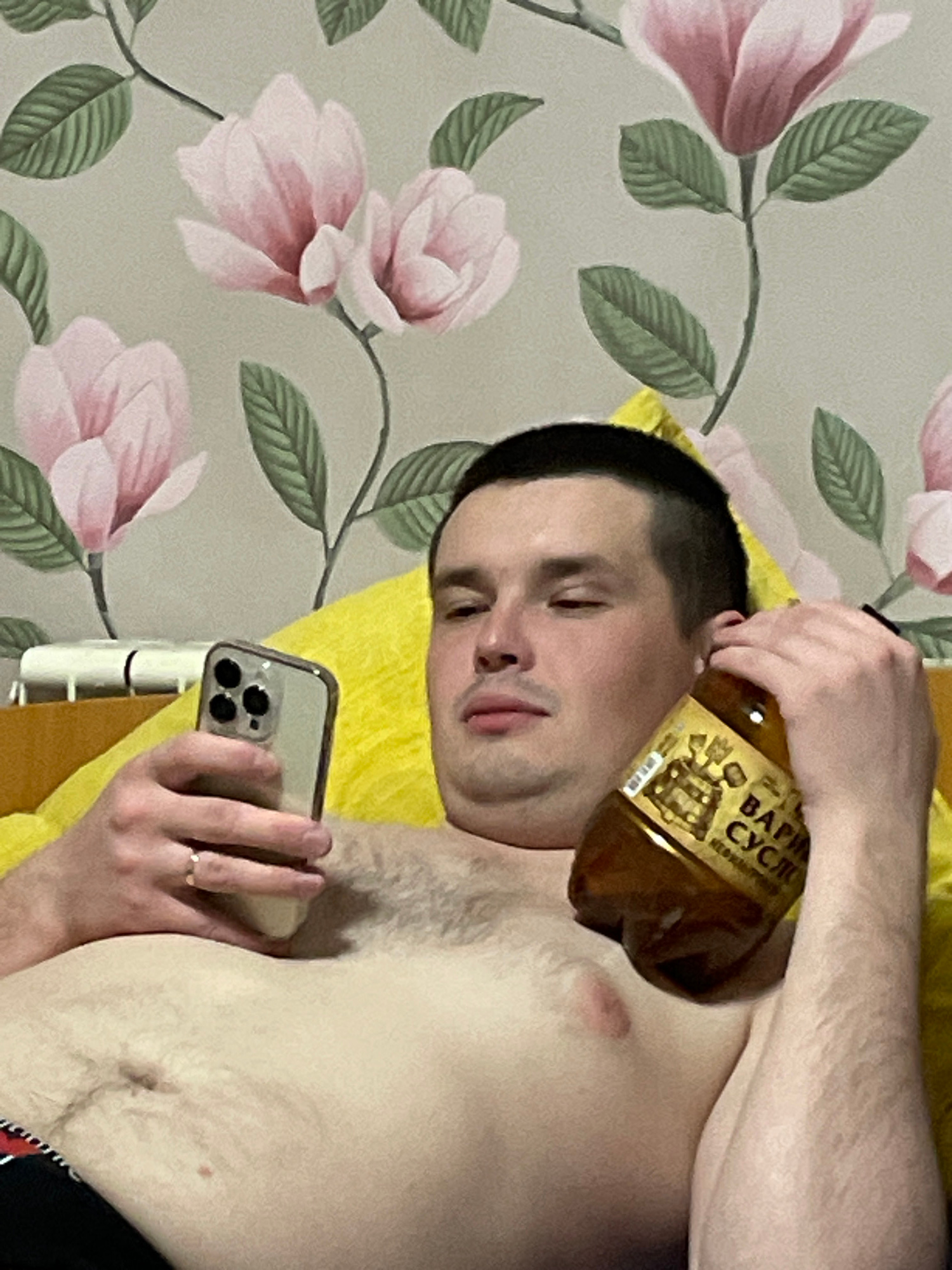 A shirtless man is lying on a yellow pillow, holding a smartphone in his right hand and a brown bottle labeled "ВАРИ СУСЛО" against his left ear. The man has short dark hair, closed eyes, and a relaxe…read more