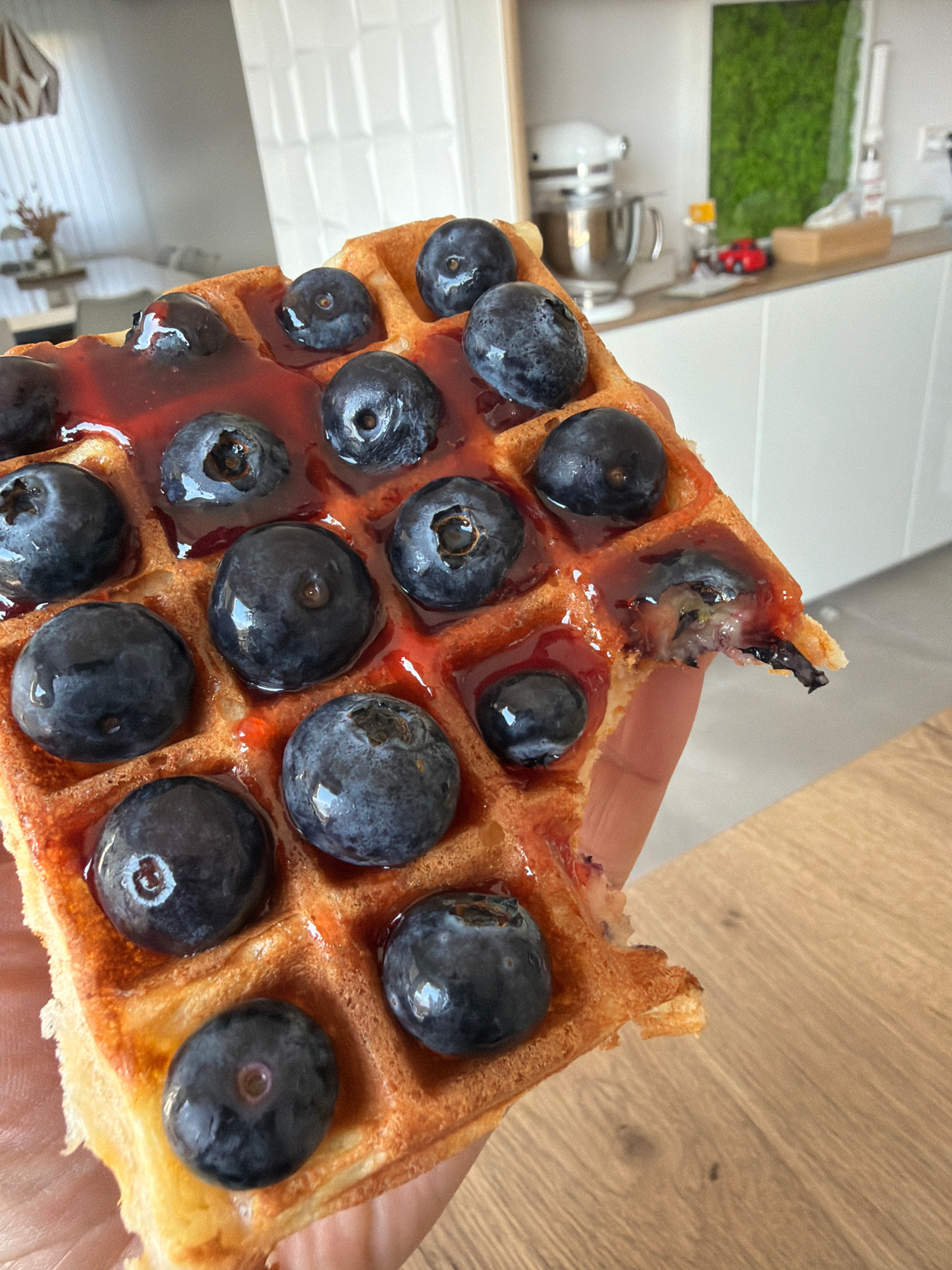 A hand holds a partially eaten waffle topped with blueberries and a red, viscous sauce. The waffle is golden brown and has a square grid pattern. The blueberries are plump and dark blue, with some app…read more
