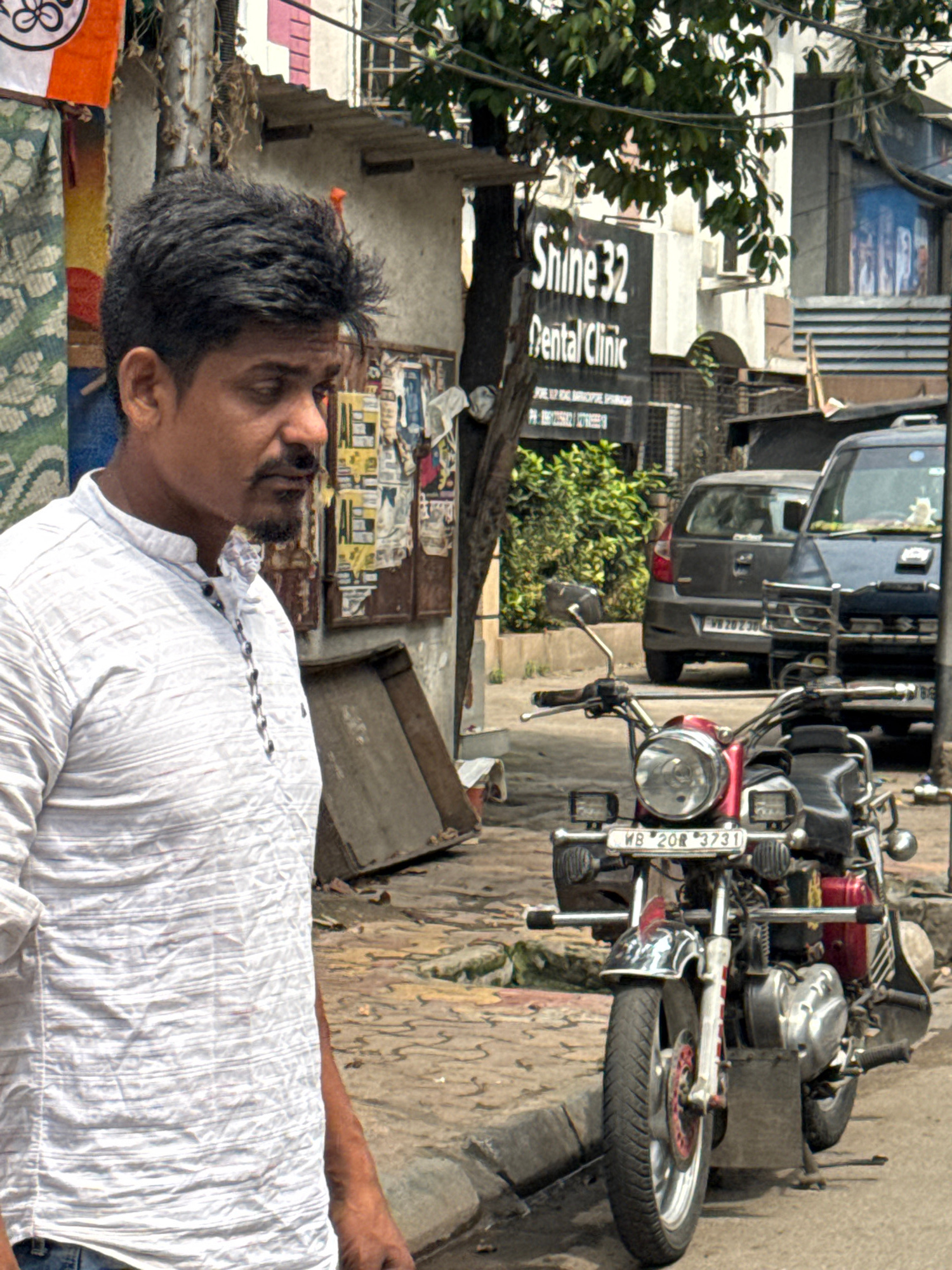 The image shows a man wearing a white patterned shirt in an urban environment. Behind him is a display of political flags and textiles. Above, there is a motorcycle parked alongside a street, partiall…read more