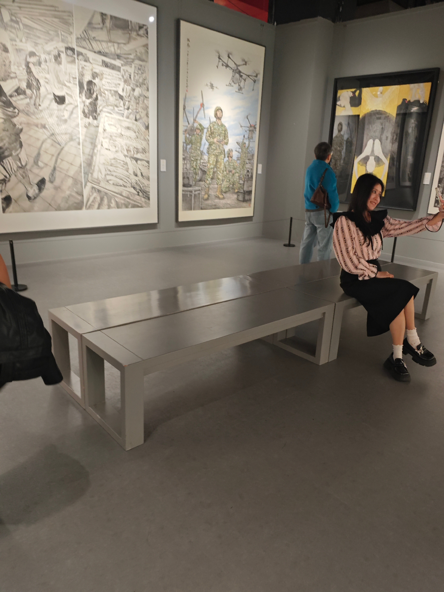 A woman is sitting on a long metal bench in an art gallery, taking a selfie with her phone. The gallery has multiple large paintings on the walls, one of which shows soldiers and drones. Another perso…read more