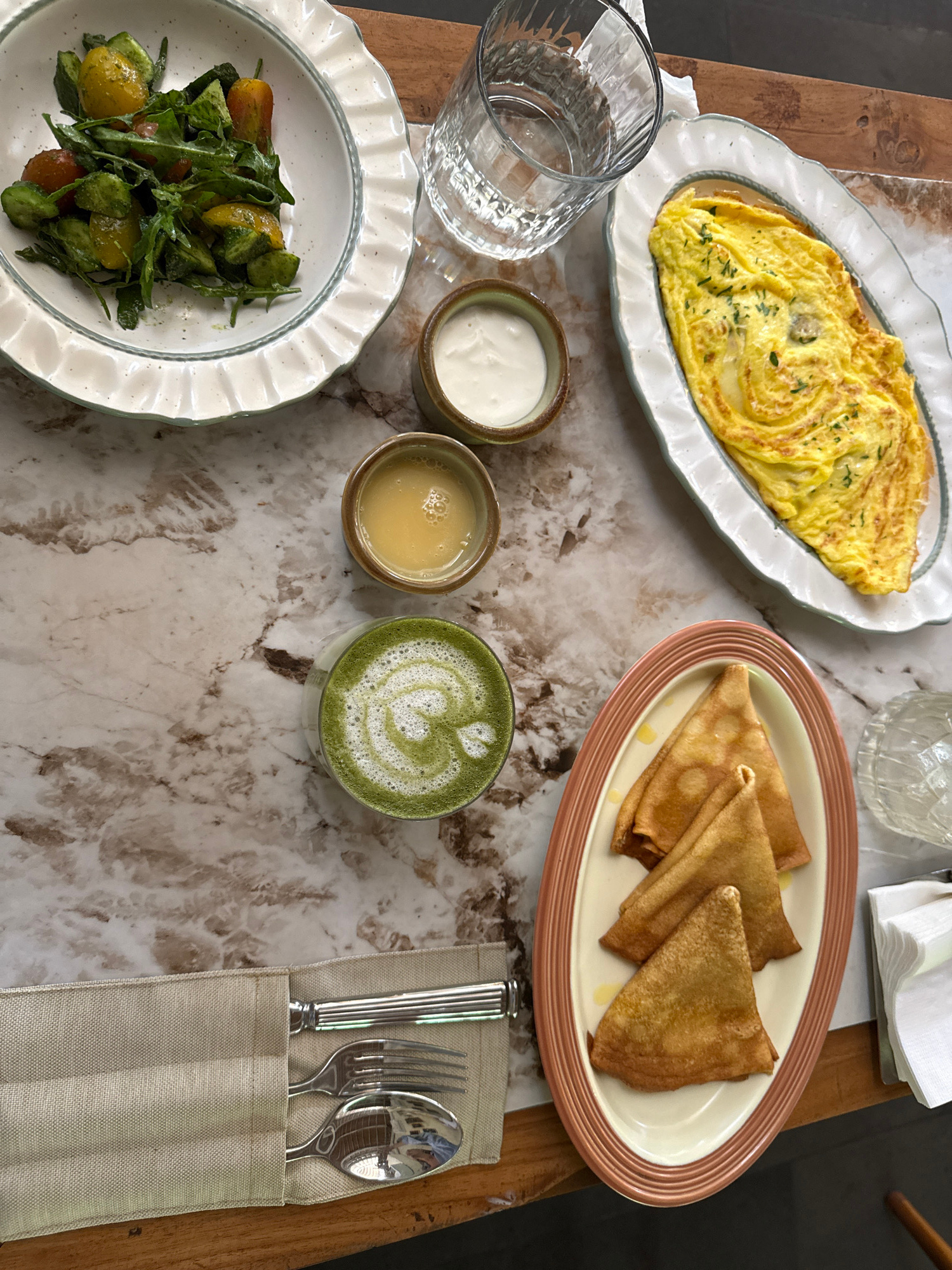 The image depicts a breakfast spread on a marble-patterned table, possibly in a cafe or restaurant in Ubud, Indonesia. The breakfast consists of an omelet on a white scalloped plate, crepes on a coral…read more