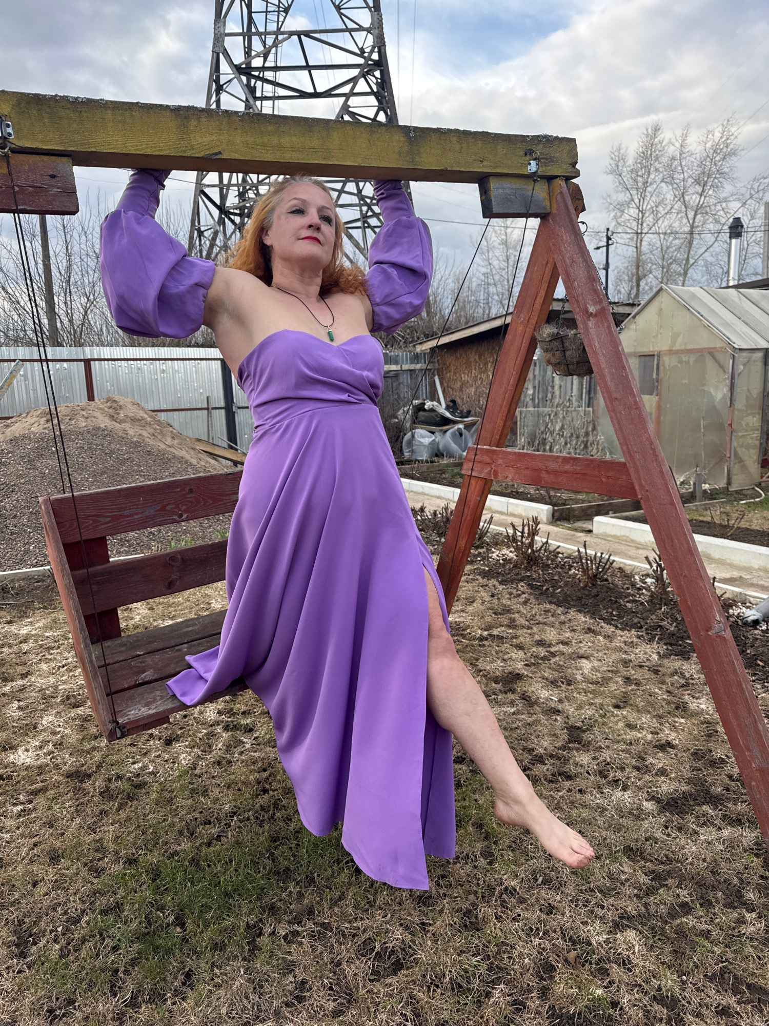 An outdoor, eye-level shot captures a woman in a vibrant purple dress against a rustic backdrop, rotated 90 degrees clockwise. The woman, with fair skin and reddish-blonde hair, is looking directly at…read more
