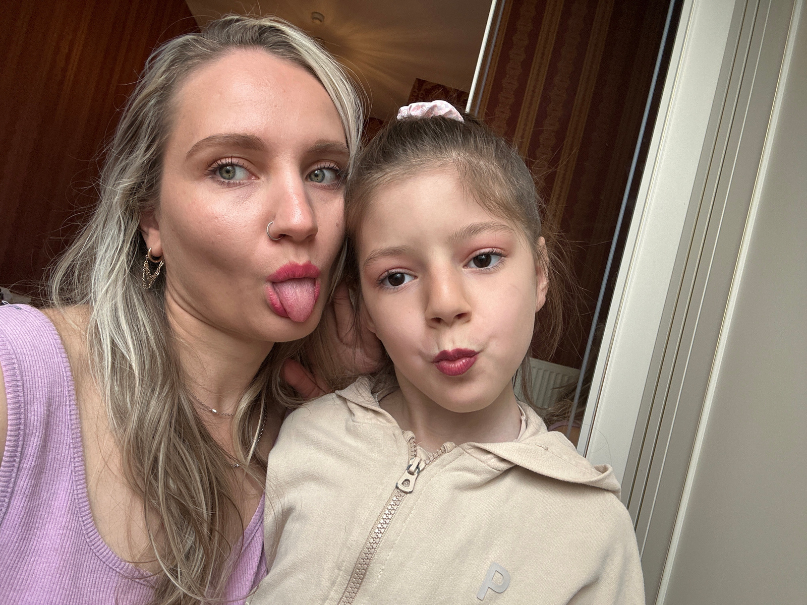 A woman and a girl are in a selfie taken indoors, appearing to be in a home. The woman is on the right wearing a lilac top, and a silver nose ring. She has long blonde hair and is sticking her tongue…read more