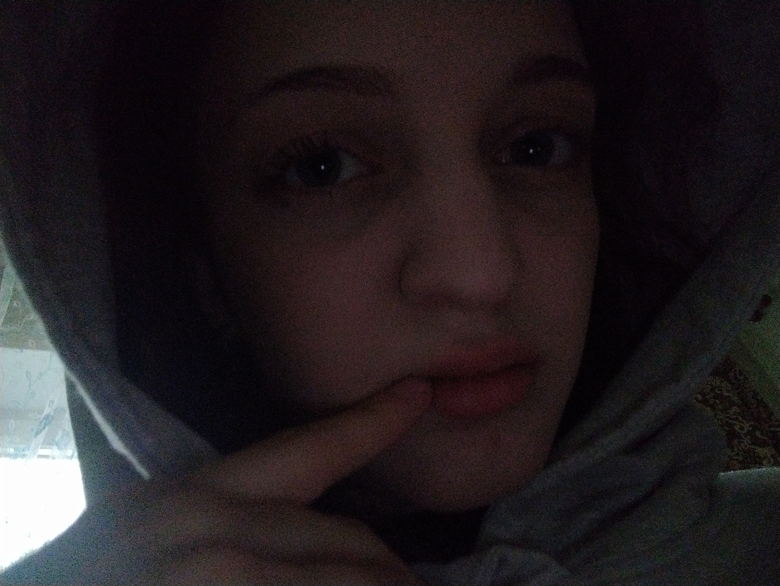 A close-up, underexposed photograph depicts a person with fair skin wearing a grey hooded sweatshirt. The hood is pulled up, casting shadows around the face. The person is looking directly at the cameβ¦read more