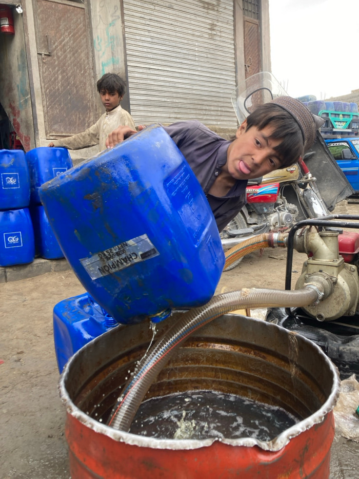 The scene is set outdoors in Quetta City Tehsil, Pakistan. A young boy in a dark shirt and cap is shown in the foreground, tilting a blue plastic jerry can, labeled "CHAMPION NFT 25 KG," to pour liqui…read more
