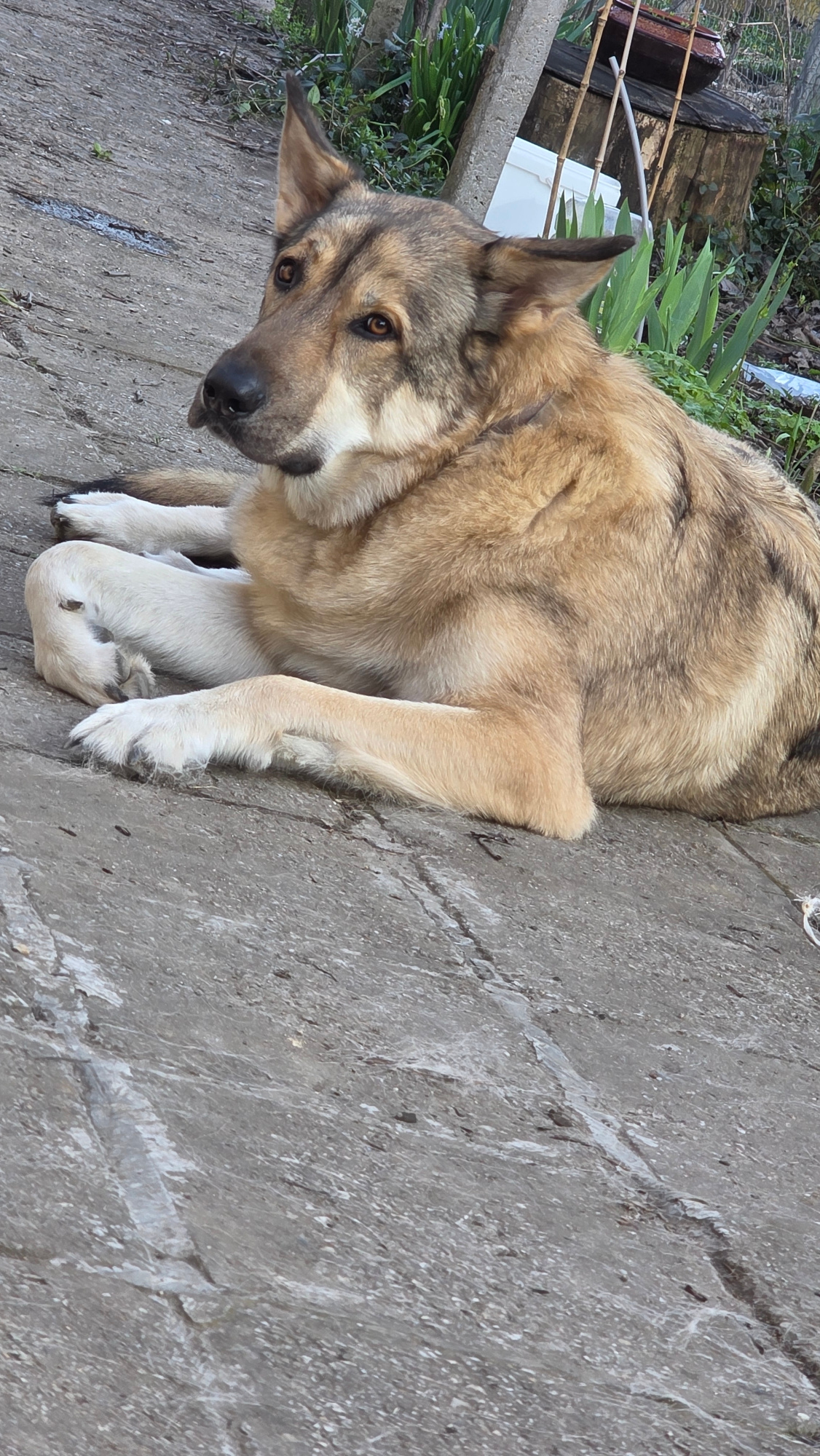 A dog with a light brown and grey coat is lying on a grey concrete surface. The dog is positioned in the lower left of the image, with its head tilted downwards and towards the viewer. Parts of garden…read more