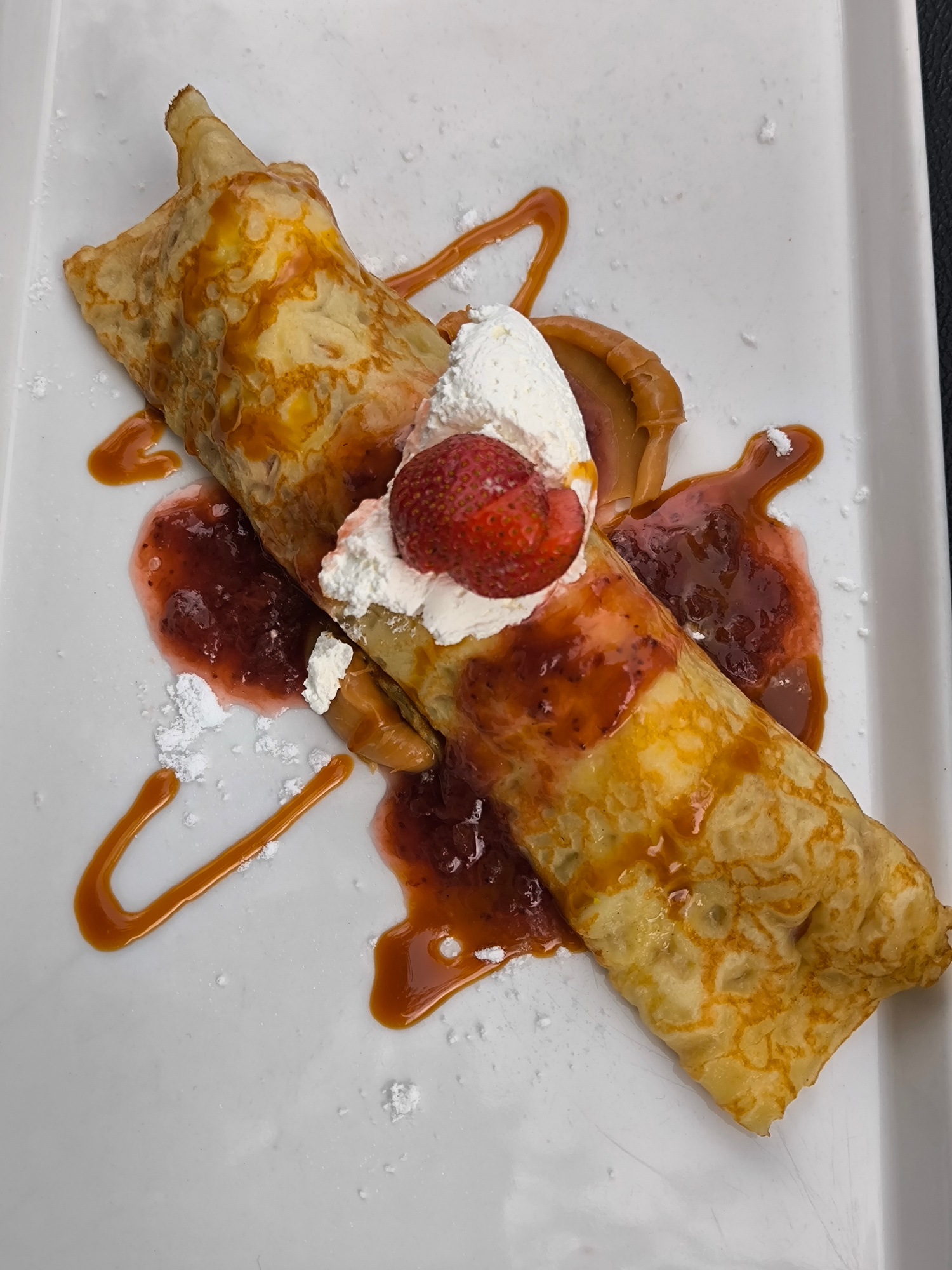 On a white rectangular plate sits a crêpe dessert. The crêpe is rolled and topped with whipped cream and a sliced strawberry. Strawberry jam and caramel sauce are drizzled around the crêpe. Powdered s…read more