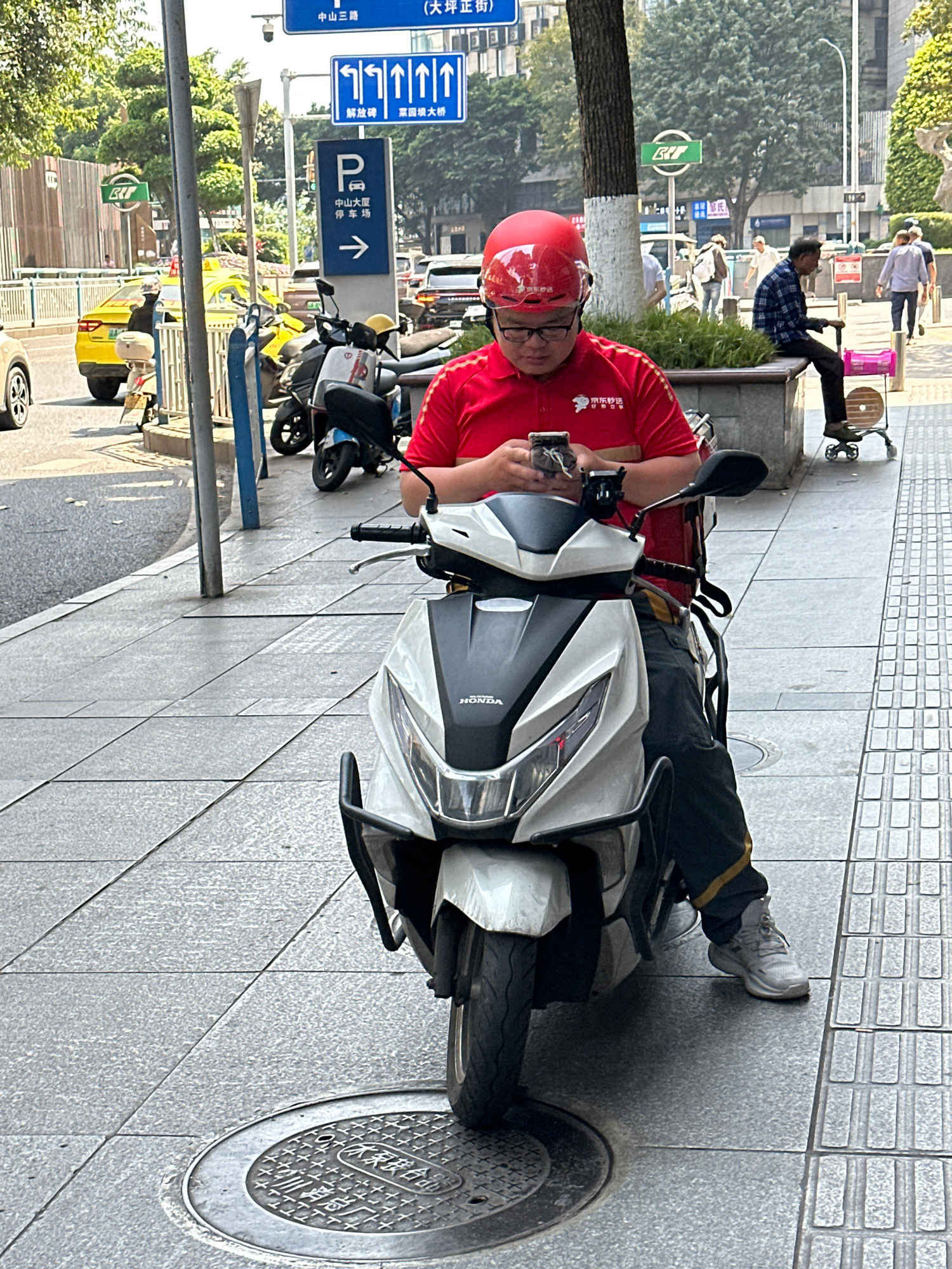 A delivery rider, dressed in a red short-sleeved uniform shirt with "京东秒送" (Jingdong Miaosong) printed on it, and a matching red helmet, is paused on a white and black Honda scooter. He is looking dow…read more