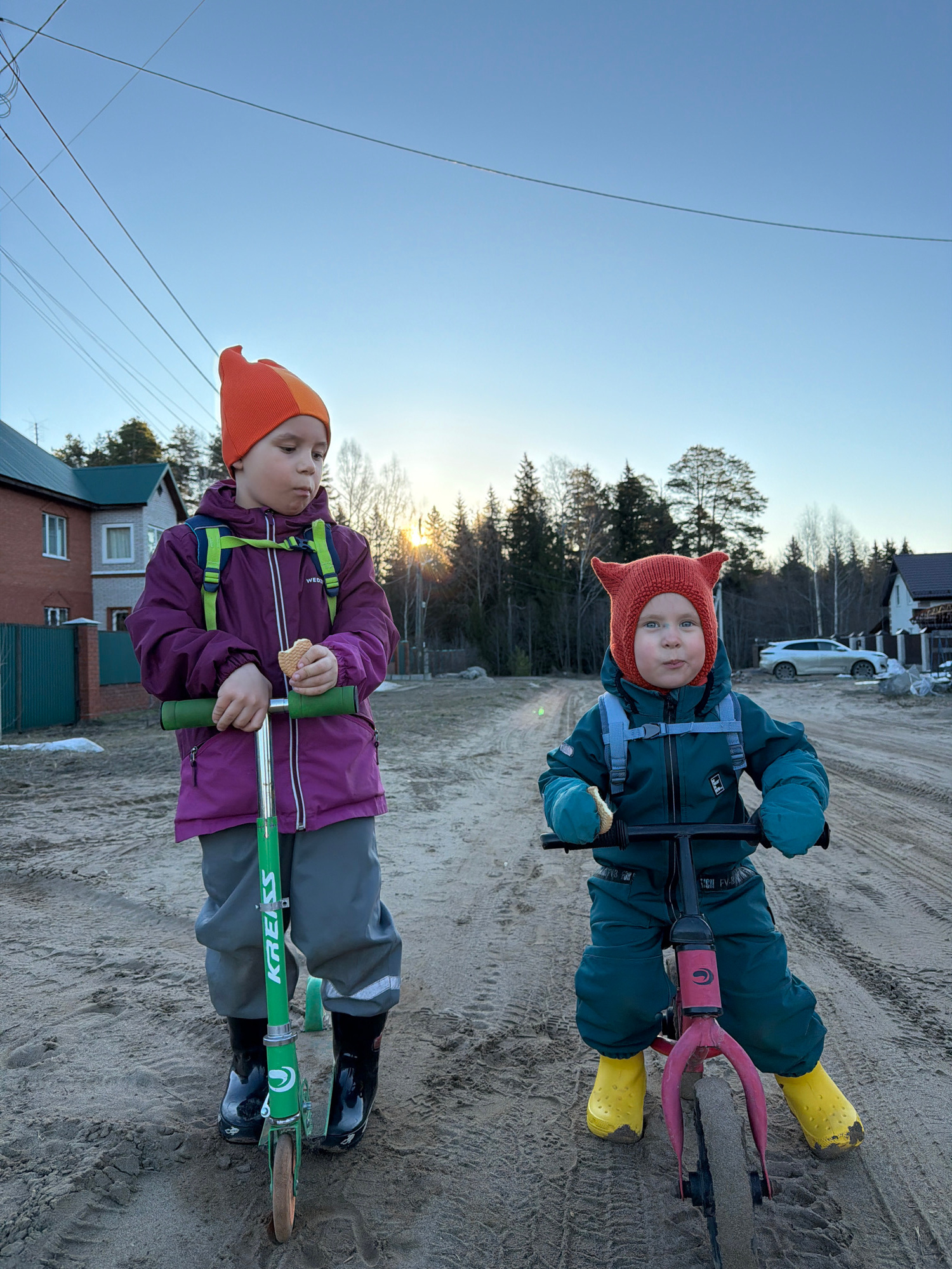 Two children are on a sandy surface outdoors, possibly a construction site or undeveloped area near a residential zone. One child, wearing an orange hat, purple jacket, and gray pants, is standing onβ¦read more