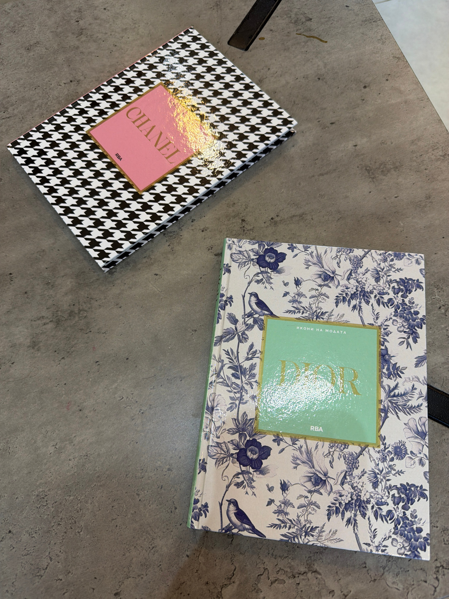The image shows two books placed on a gray surface. The book on the left has a black and white houndstooth pattern cover with a pink rectangle in the center, displaying the name "CHANEL" in gold lette…read more