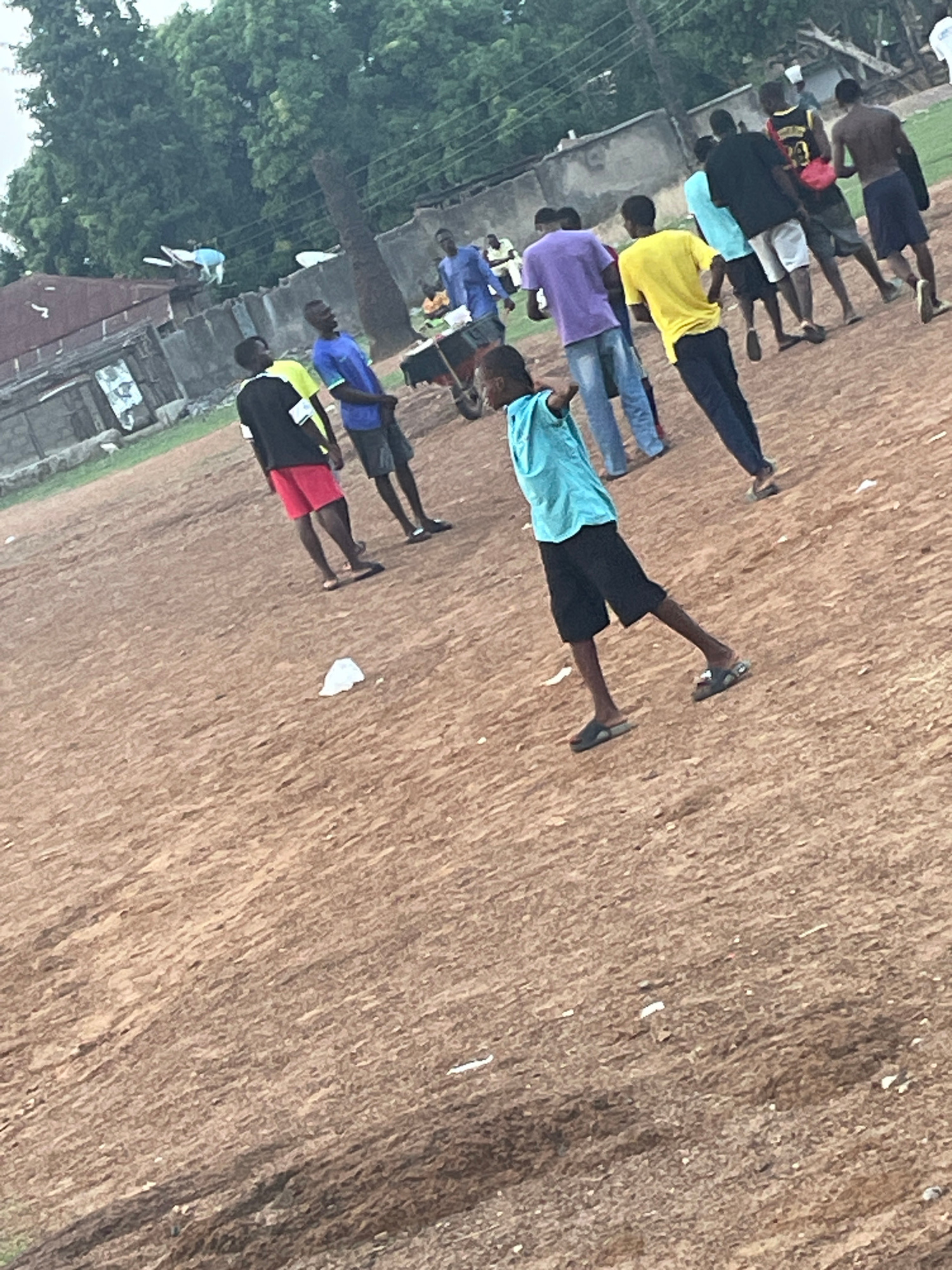 The image depicts a group of at least twelve people standing in a line on a dirt field, possibly a sports field or open ground. The individuals are wearing a variety of casual clothing, including t-sh…read more