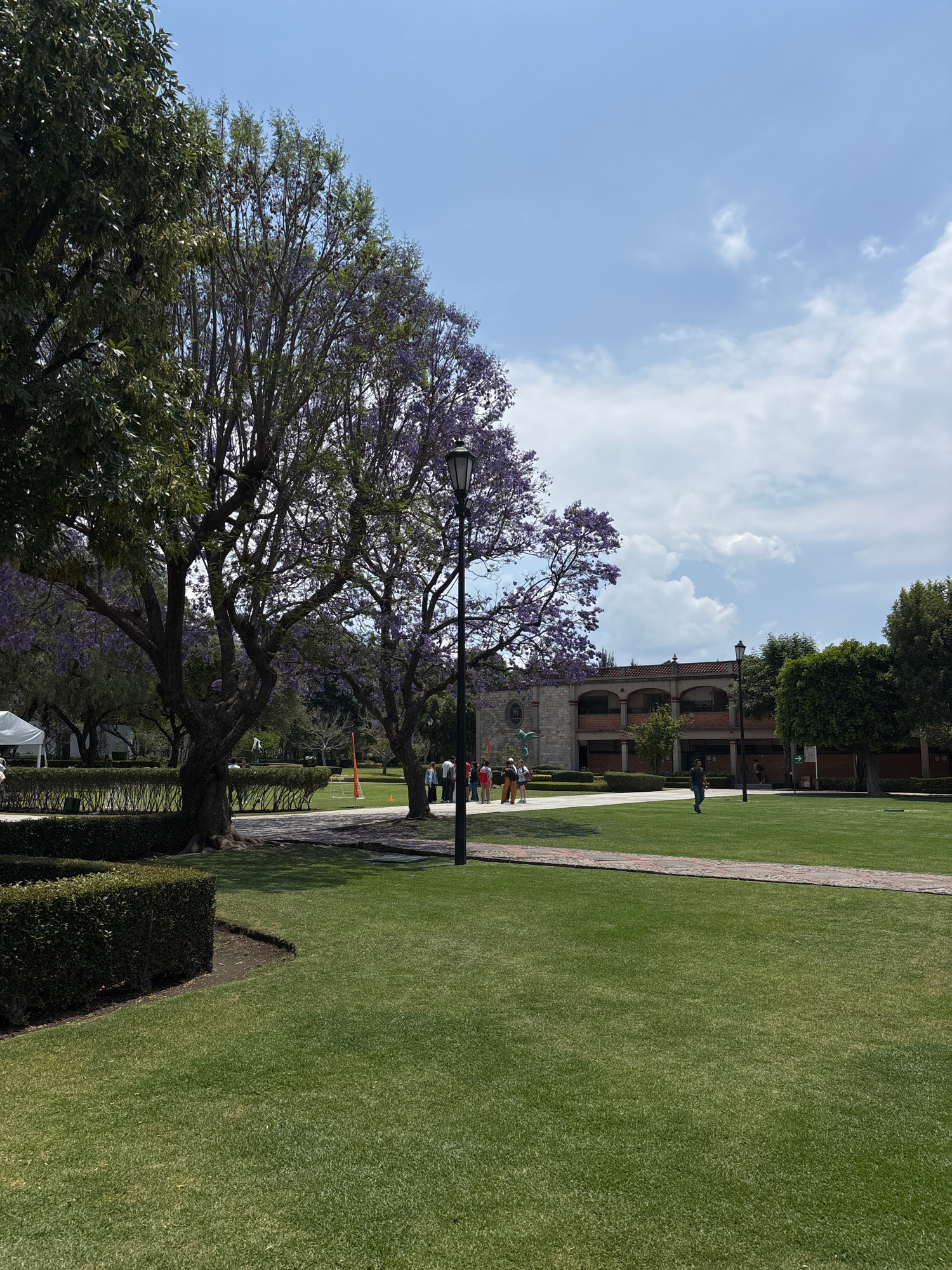 This image shows a landscape in San Andrés Cholula, Mexico, on a bright day with a blue sky and scattered clouds. In the foreground, there's a large tree with purple flowers. A lamp post is situated amongst its branches. Adjacent to the tree is a trimmed hedge and a well-maintained green lawn. A stone pathway runs along the lawn's edge. Further in the background, there's a building with arched windows and a tiled roof. Several people are visible on the pathway near the building. Beyond the building, more trees are present. A soccer goal post is also visible in the background. | Open Wire