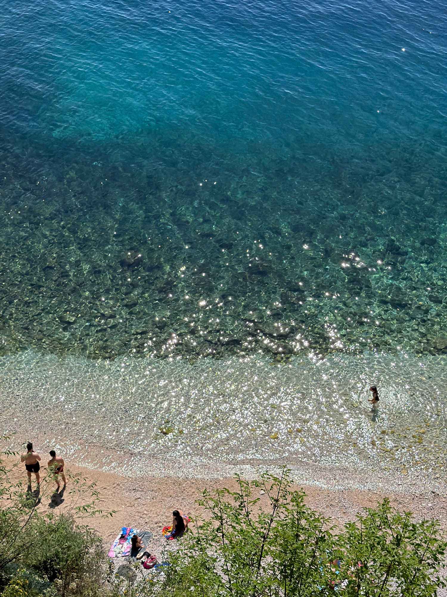 This is an aerial view of a beach in Grad Rijeka, Croatia. The scene shows a section of coastline with a gradient from deep blue water to clear shallow water revealing a pebble beach. Several people a…read more