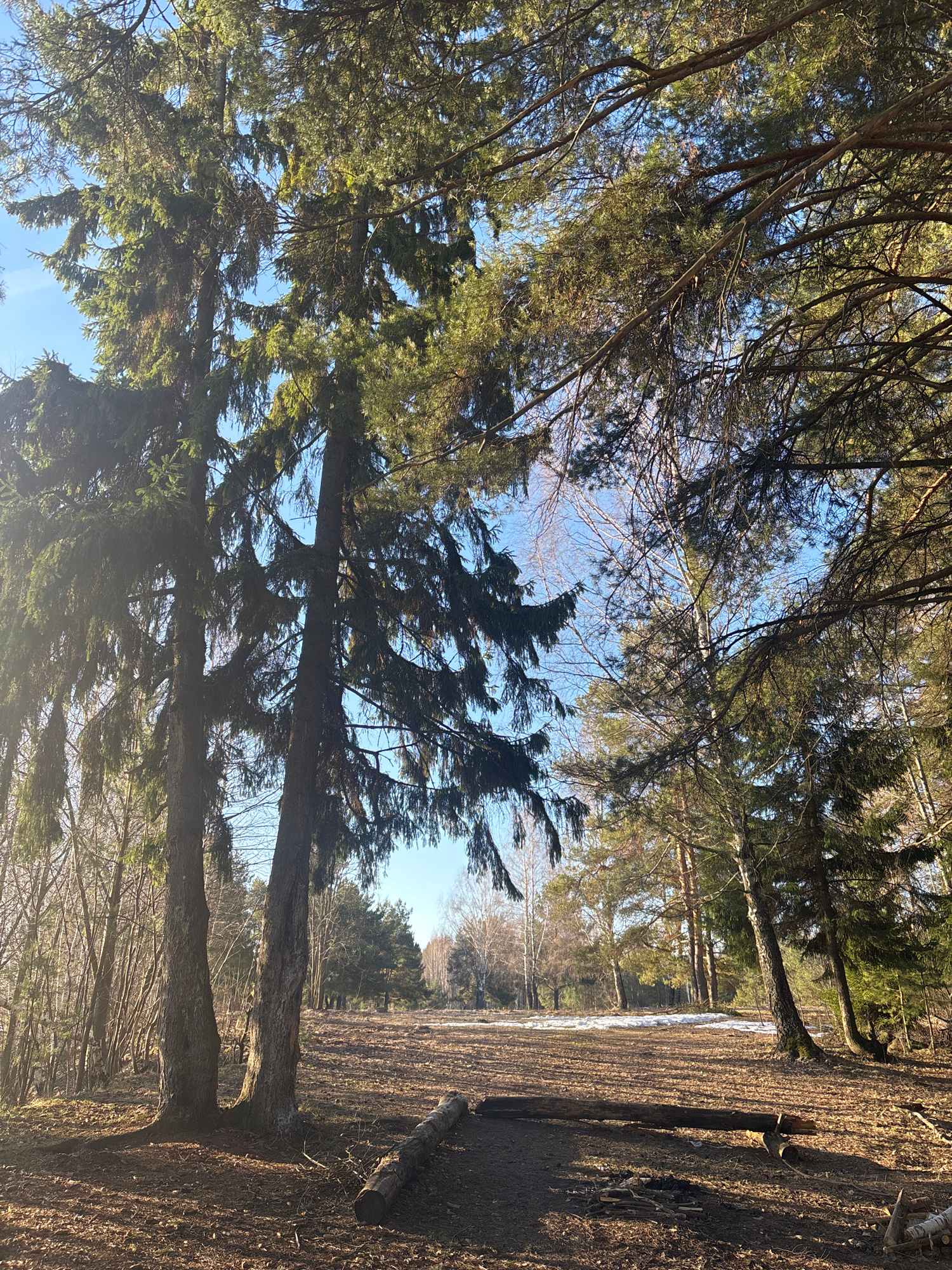 The image captures a woodland scene, likely within the city of Chaikovsky, Russia. Tall, mature trees with dense green foliage dominate the foreground, partially obscuring a patch of blue sky. The gro…read more