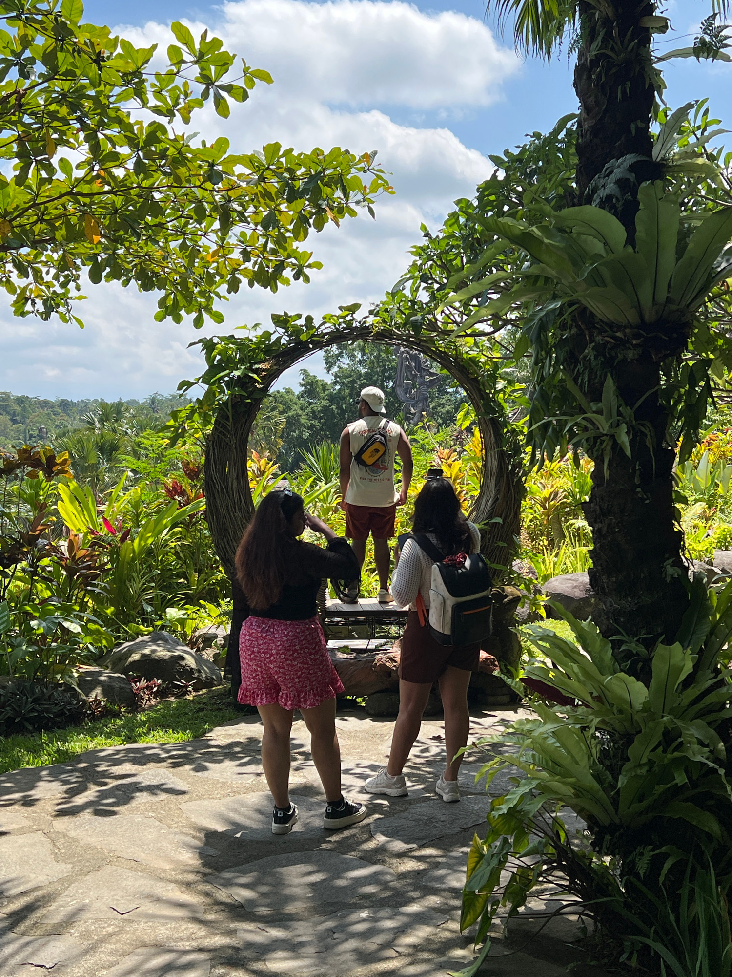 Three individuals stand within a circular, vine-covered structure positioned on a stone path amidst lush vegetation, under a partly cloudy sky. The location is Kedewatan, Indonesia. One individual, we…read more