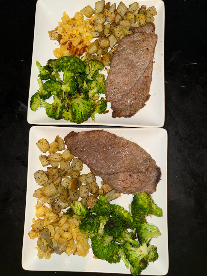 Two rectangular white plates containing identical meals are presented on a dark, unidentifiable surface. The specific location within Los Angeles, United States of America, is not discernible from the…read more