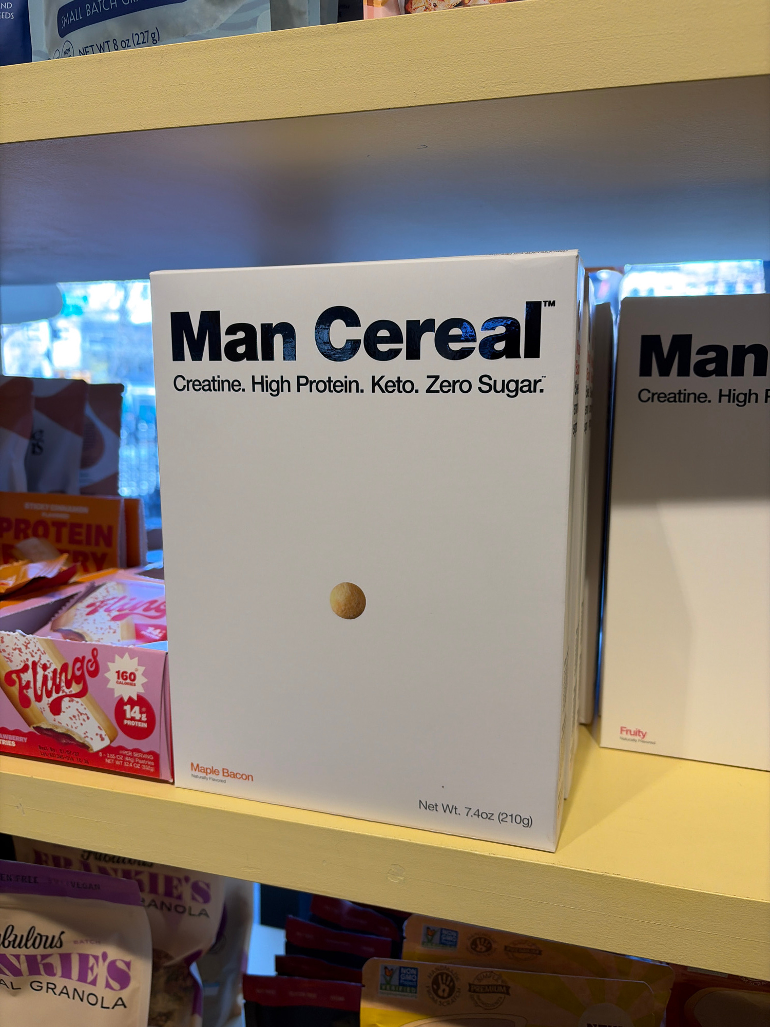 The image shows a close-up of a shelf stocked with various food products. Dominating the view is a white box of "Man Cereal" with the text "Creatine. High Protein. Keto. Zero Sugar." in black. Below t…read more