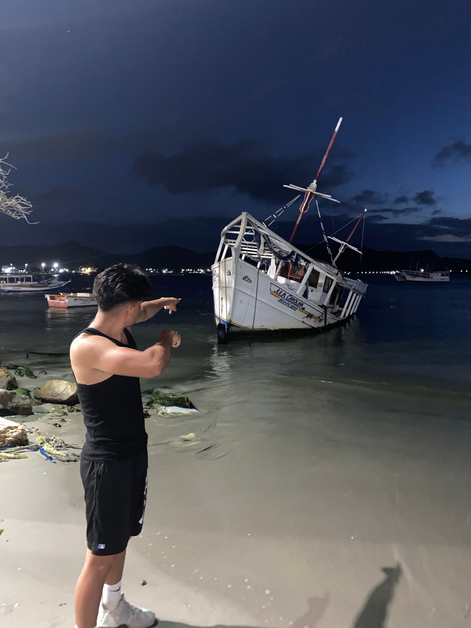 A man wearing a black tank top, black shorts, white socks, and white shoes stands on a beach. He is pointing towards a partially submerged boat. The boat is white with a red and white mast and has the…read more