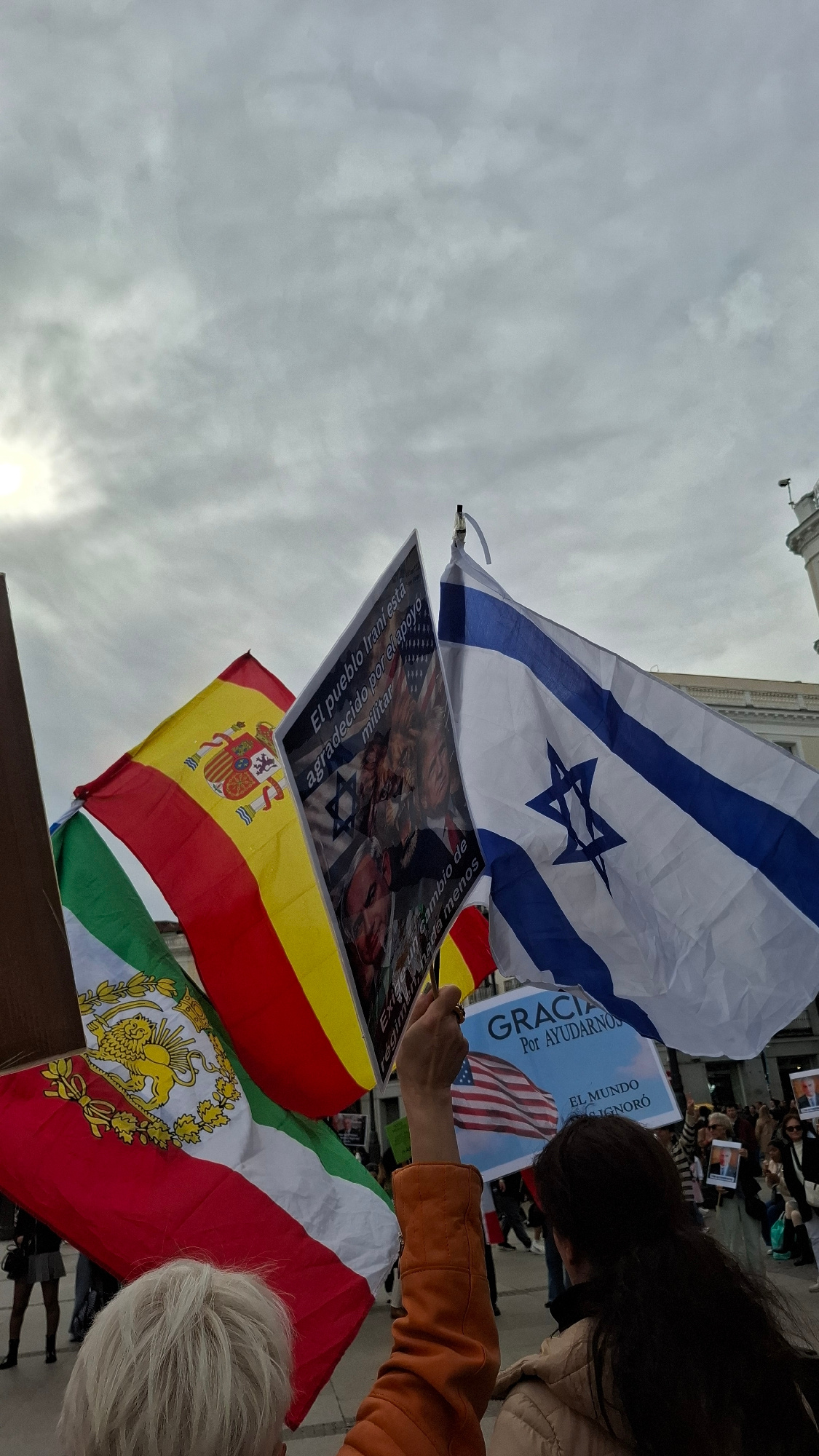 This image depicts an outdoor political demonstration occurring under an overcast sky in Puerta del Sol, Madrid, Spain. In the foreground, multiple individuals are gathered, displaying flags and prote…read more