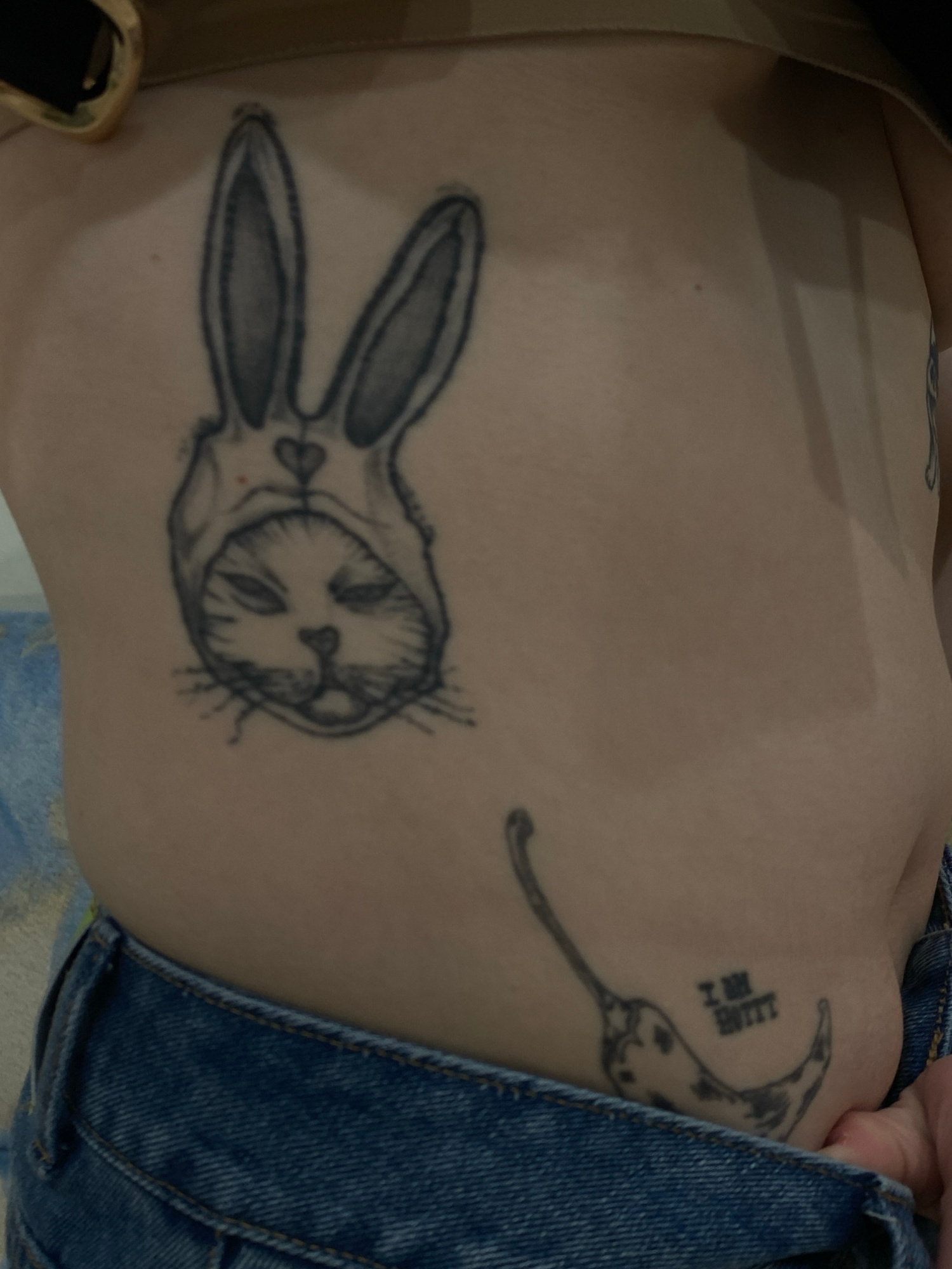 A person's torso is shown, displaying two distinct tattoos. One tattoo features a stylized image of a rabbit face enclosed within a rabbit-ear outline. The second tattoo depicts a chili pepper with te…read more