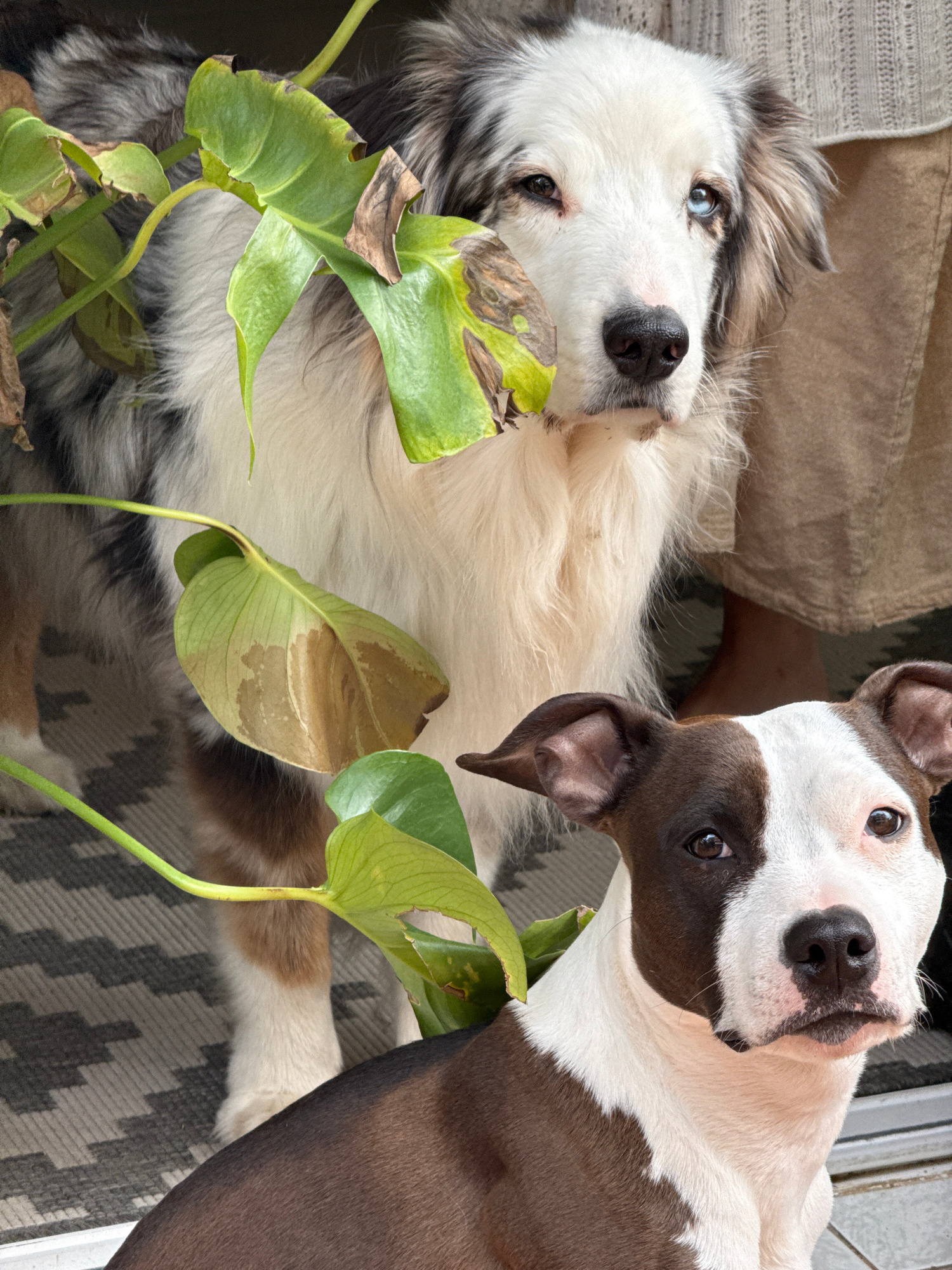 Two dogs are visible. One is an Australian Shepherd with white, grey, and brown fur and one blue eye. The second dog is a brown and white pit bull. Both are lying on a grey and white geometric pattern…read more