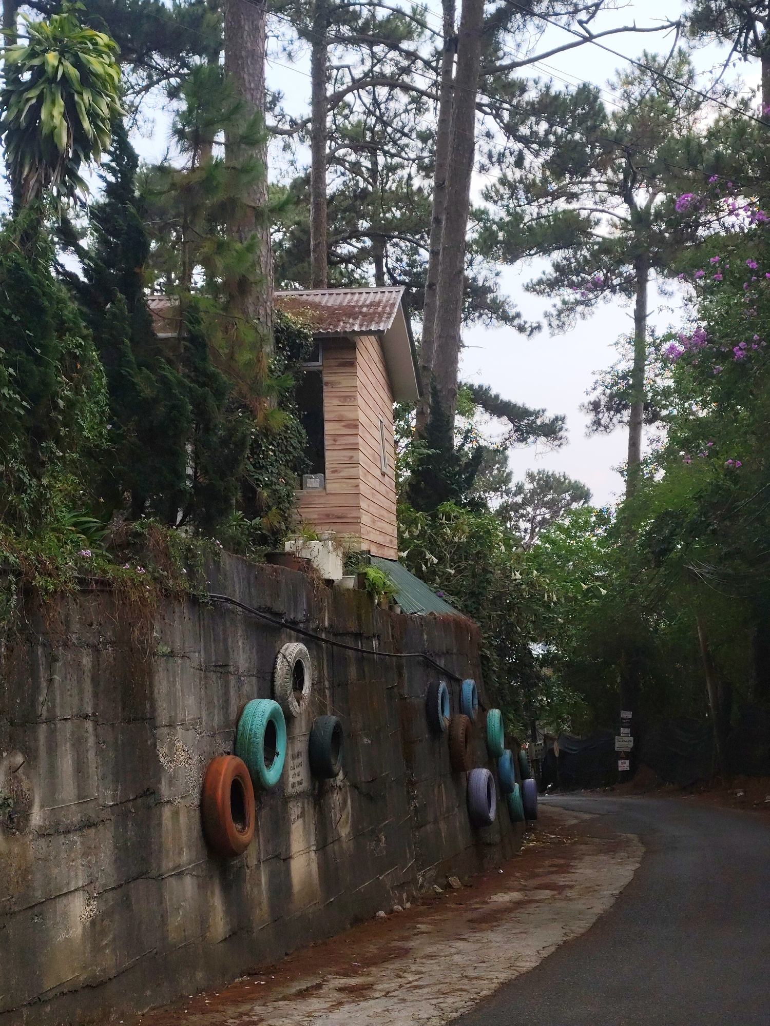 The scene is a street in Da Lat, Vietnam. A concrete wall runs along the roadside, adorned with colorful, painted car tires. Above the wall, a small, wooden building nestles amongst pine trees and lus…read more