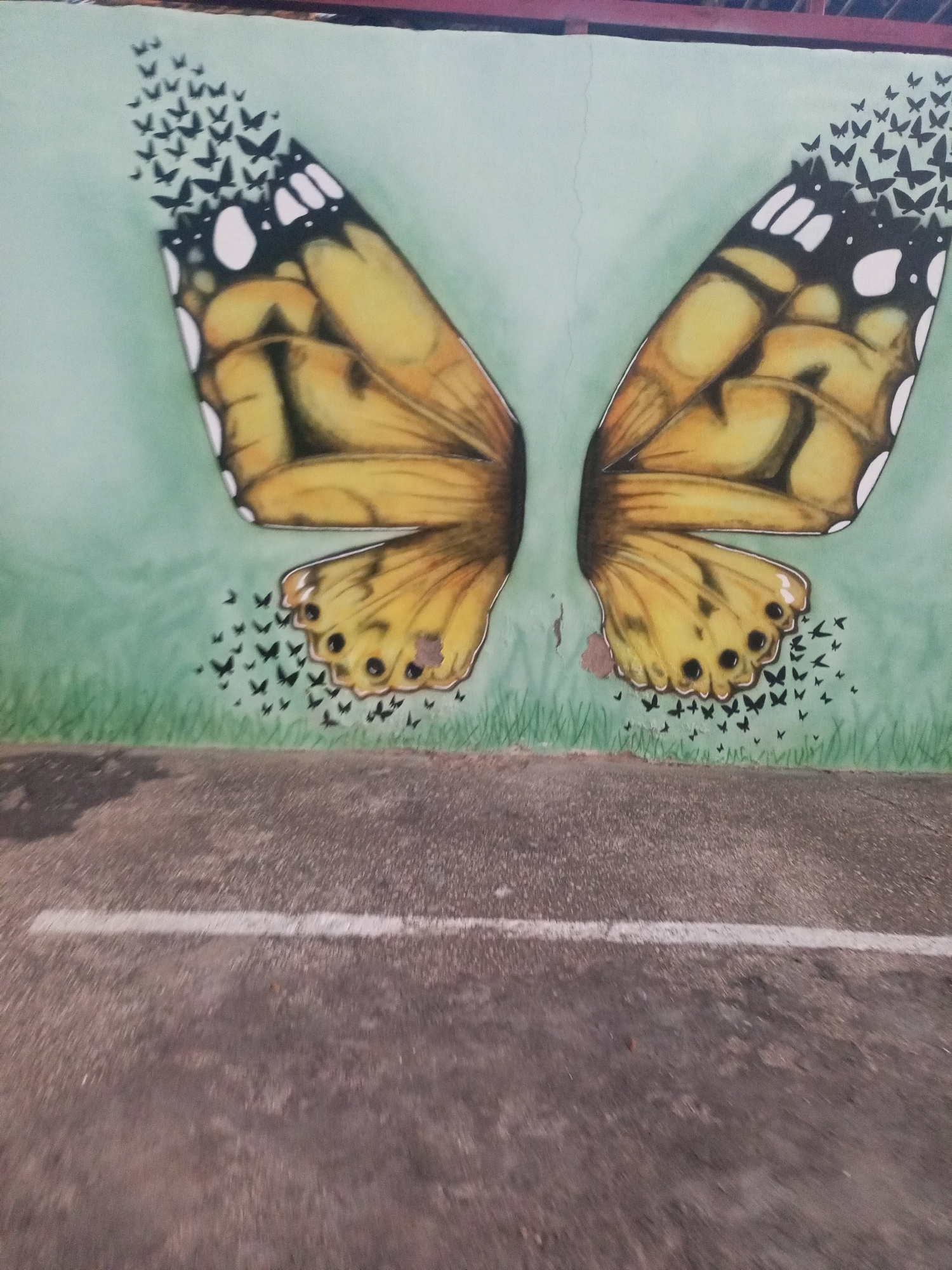 A colorful mural depicts two butterfly wings painted on a wall in what is presumably Juan Griego, Venezuela. The wings are predominantly yellow with black and white markings along the upper edges. The…read more
